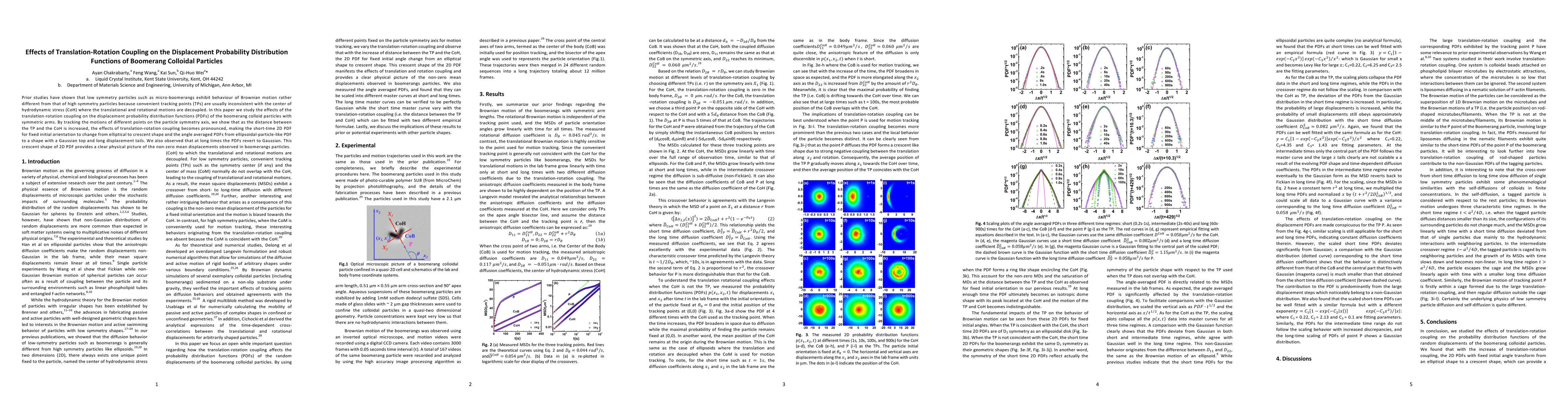 This paper investigates how translation-rotation coupling affects the displacement probability distribution functions of boomerang colloidal particles, revealing that increased distance between tracking points and the center of hydrodynamic stress leads to a shift from elliptical to crescent-shaped short-time 2D PDFs, and from ellipsoidal to Gaussian-top shapes with long tails in angle averaged PDFs.