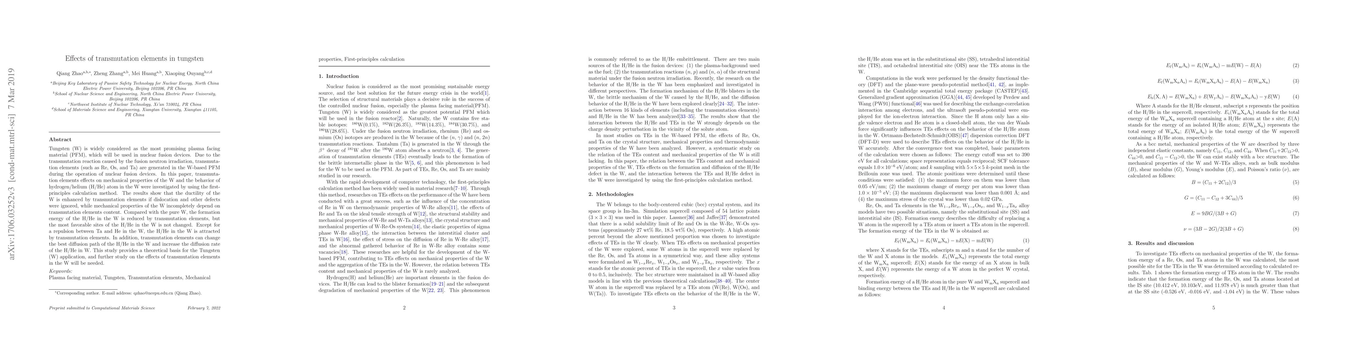 This paper investigates the impact of transmutation elements (Re, Os, Ta) in tungsten used as a plasma facing material in nuclear fusion devices, revealing that these elements enhance ductility and reduce hydrogen/helium formation energy while altering diffusion paths and rates, providing a theoretical foundation for tungsten applications in fusion technology.