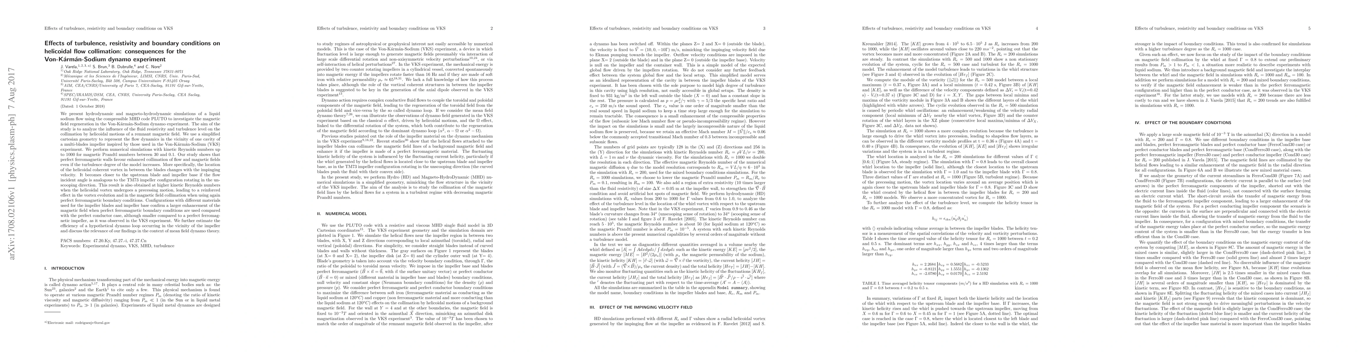 This study investigates the impact of turbulence, resistivity, and boundary conditions on helicoidal flow collimation in a liquid sodium flow using MHD simulations. The findings indicate that perfect ferromagnetic walls enhance magnetic field collimation despite increased turbulence, with the helicoidal vortex's location shifting based on flow incident angles and kinetic Reynolds numbers.