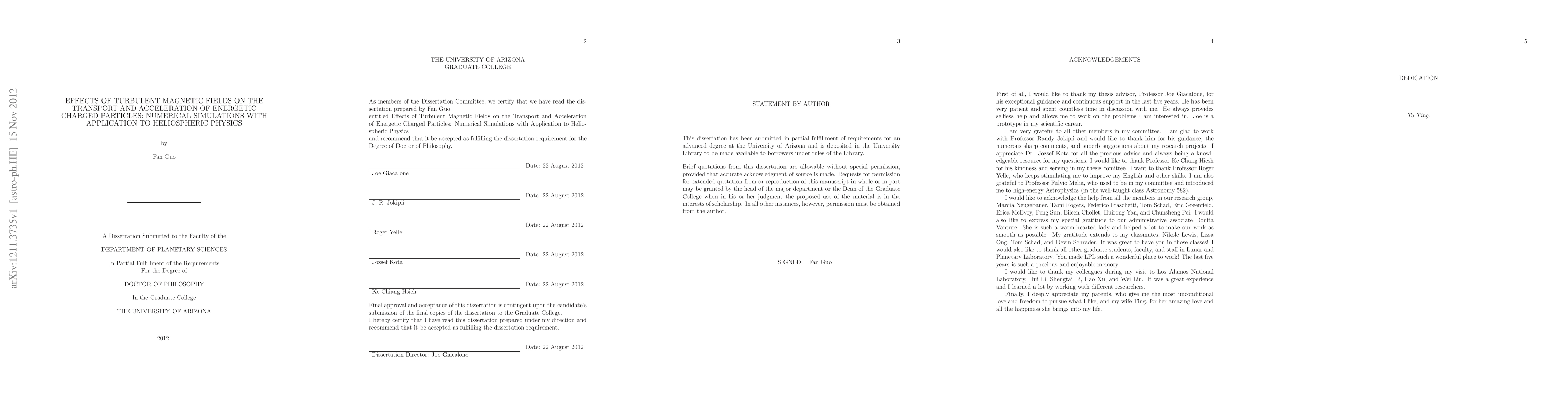 This paper investigates the effects of turbulent magnetic fields on the transport and acceleration of energetic charged particles using numerical simulations. It finds that small-scale turbulence variations can reproduce particle dropouts and velocity dispersions, questioning the two-component model. The study also reveals mechanisms for ion and electron acceleration at shocks, showing that protons gain energy through reflection and electrons benefit from field-line braiding and ripples, particularly in perpendicular shocks.