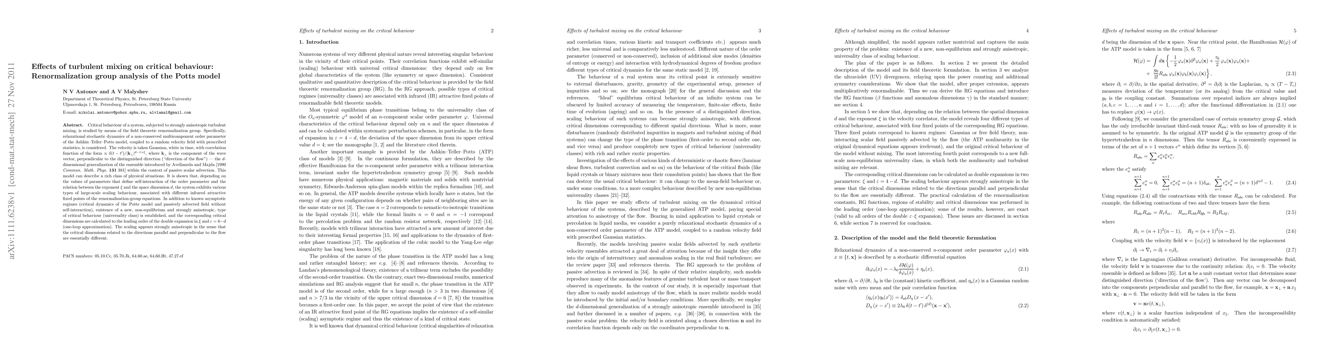 This paper investigates the critical behaviour of systems under anisotropic turbulent mixing using renormalization group analysis of the Potts model. It reveals various types of large-scale scaling behaviours and identifies a new non-equilibrium, anisotropic universality class, with distinct critical dimensions for directions parallel and perpendicular to the flow.