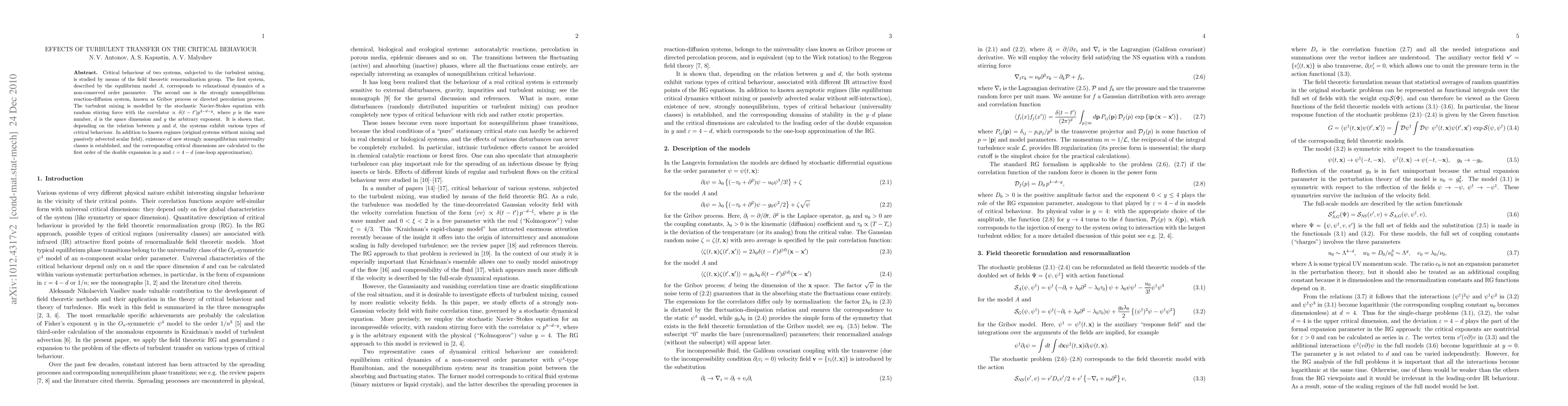 This paper investigates the critical behaviour of two systems under turbulent mixing using field theory and renormalization group methods. It identifies new nonequilibrium universality classes and calculates critical dimensions for various relations between space dimension and an exponent, revealing diverse critical behaviour types.