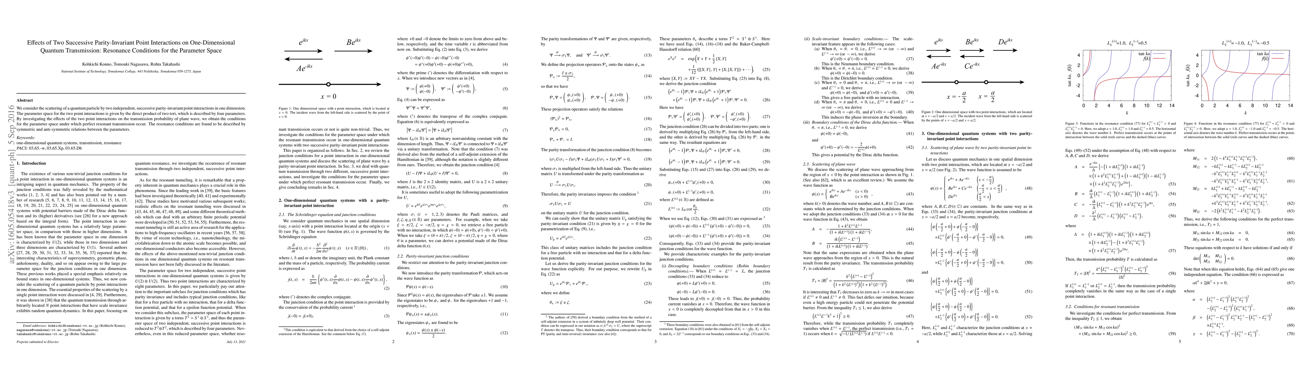 We consider the scattering of a quantum particle by two independent, successive parity-invariant point interactions in one dimension. The parameter space for the two point interactions is given by the direct product of two tori, which is described by four parameters. By investigating the effects of the two point interactions on the transmission probability of plane wave, we obtain the conditions for the parameter space under which perfect resonant transmission occur. The resonance conditions are found to be described by symmetric and anti-symmetric relations between the parameters.