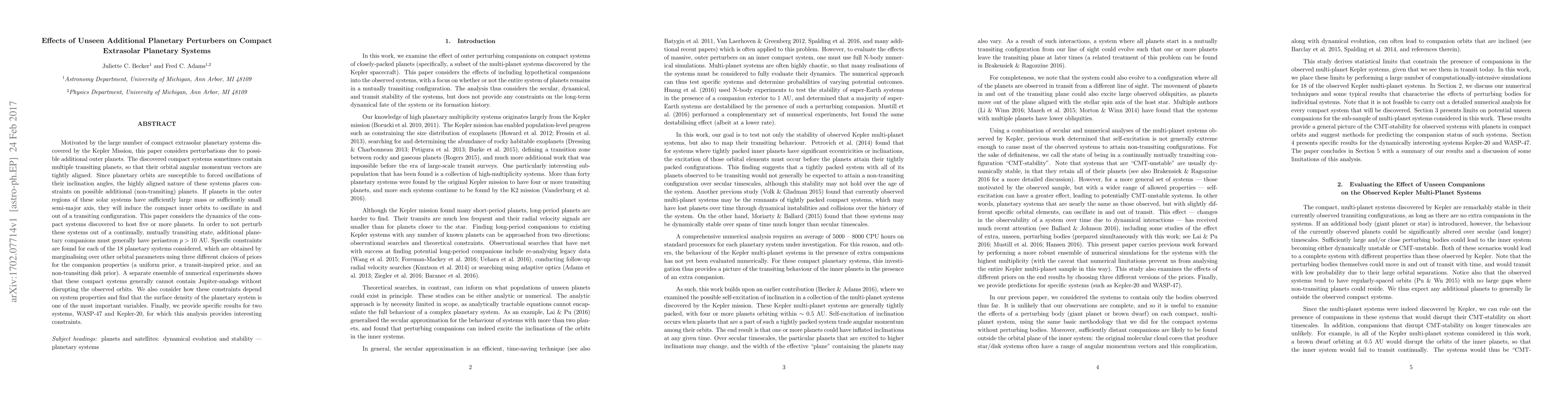 This paper investigates the influence of unseen additional planetary perturbers on compact extrasolar planetary systems, finding that such perturbers must have periastron greater than 10 AU to avoid disrupting the transiting configuration of inner planets. The study concludes that Jupiter-analogs are generally incompatible with these systems without disrupting observed orbits.