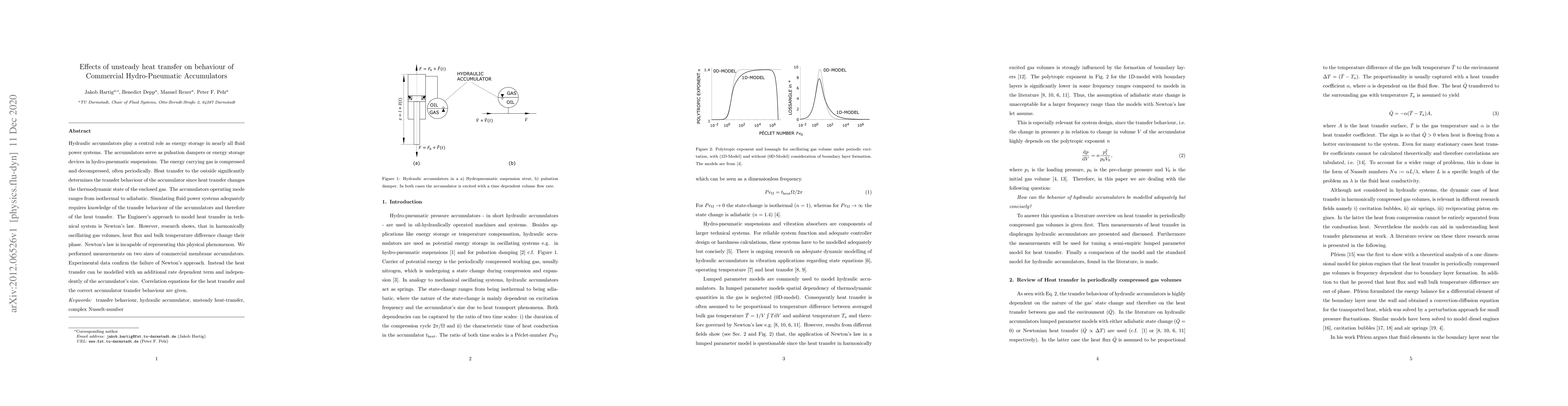 Hydraulic accumulators play a central role as energy storage in nearly all fluid power systems. The accumulators serve as pulsation dampers or energy storage devices in hydro-pneumatic suspensions. The energy carrying gas is compressed and decompressed, often periodically. Heat transfer to the outside significantly determines the transfer behaviour of the accumulator since heat transfer changes the thermodynamic state of the enclosed gas. The accumulators operating mode ranges from isothermal to adiabatic. Simulating fluid power systems adequately requires knowledge of the transfer behaviour of the accumulators and therefore of the heat transfer. The Engineer's approach to model heat transfer in technical system is Newton's law. However, research shows, that in harmonically oscillating gas volumes, heat flux and bulk temperature difference change their phase. Newton's law is incapable of representing this physical phenomenon. We performed measurements on two sizes of commercial membrane accumulators. Experimental data confirm the failure of Newton's approach. Instead the heat transfer can be modelled with an additional rate dependent term and independently of the accumulator's size. Correlation equations for the heat transfer and the correct accumulator transfer behaviour are given.