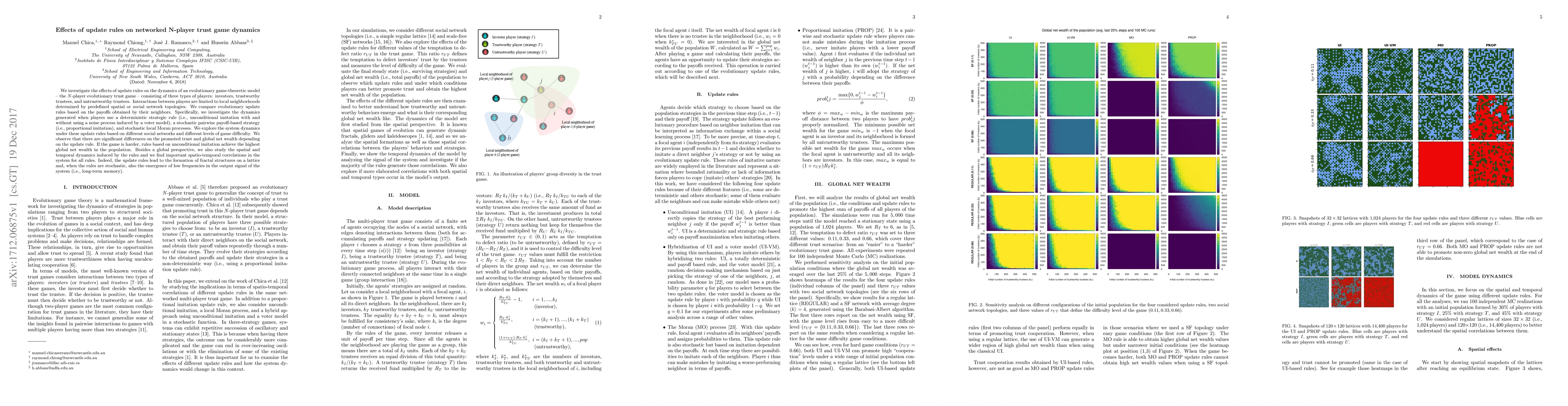 This study explores the impact of various update rules on the dynamics of an N-player trust game, revealing significant differences in trust and wealth based on the rule used. Stochastic rules promote fractal structures and long-term memory, while deterministic rules yield higher global net wealth in harder games.