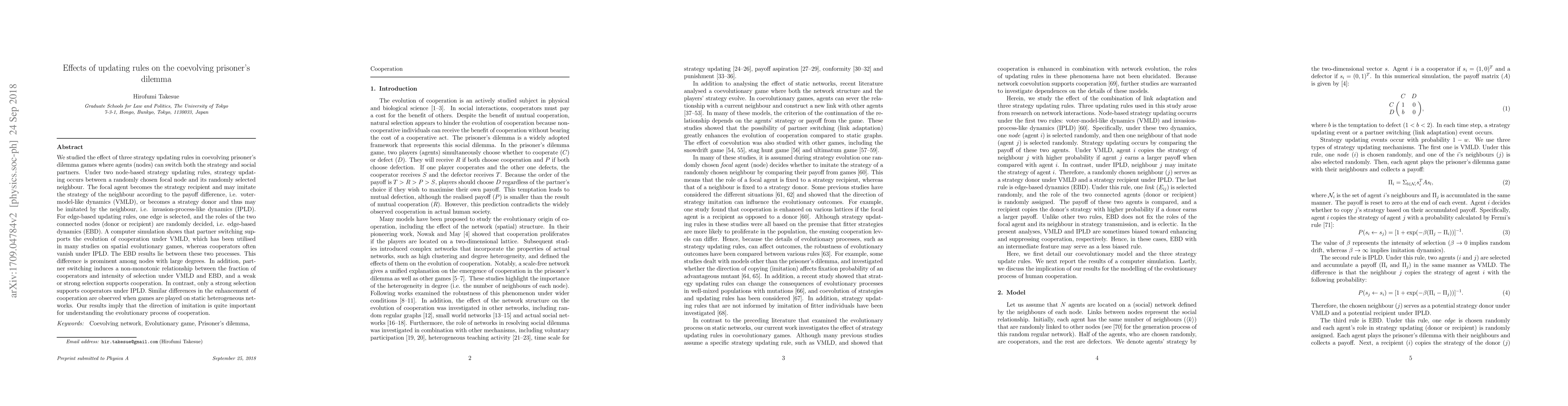 We studied the effect of three strategy updating rules in coevolving prisoner's dilemma games where agents (nodes) can switch both the strategy and social partners. Under two node-based strategy updating rules, strategy updating occurs between a randomly chosen focal node and its randomly selected neighbour. The focal agent becomes the strategy recipient and may imitate the strategy of the neighbour according to the payoff difference, i.e. voter-model-like dynamics (VMLD), or becomes a strategy donor and thus may be imitated by the neighbour, i.e. invasion-process-like dynamics (IPLD). For edge-based updating rules, one edge is selected, and the roles of the two connected nodes (donor or recipient) are randomly decided, i.e. edge-based dynamics (EBD). A computer simulation shows that partner switching supports the evolution of cooperation under VMLD, which has been utilised in many studies on spatial evolutionary games, whereas cooperators often vanish under IPLD. The EBD results lie between these two processes. This difference is prominent among nodes with large degrees. In addition, partner switching induces a non-monotonic relationship between the fraction of cooperators and intensity of selection under VMLD and EBD, and a weak or strong selection supports cooperation. In contrast, only a strong selection supports cooperators under IPLD. Similar differences in the enhancement of cooperation are observed when games are played on static heterogeneous networks. Our results imply that the direction of imitation is quite important for understanding the evolutionary process of cooperation.