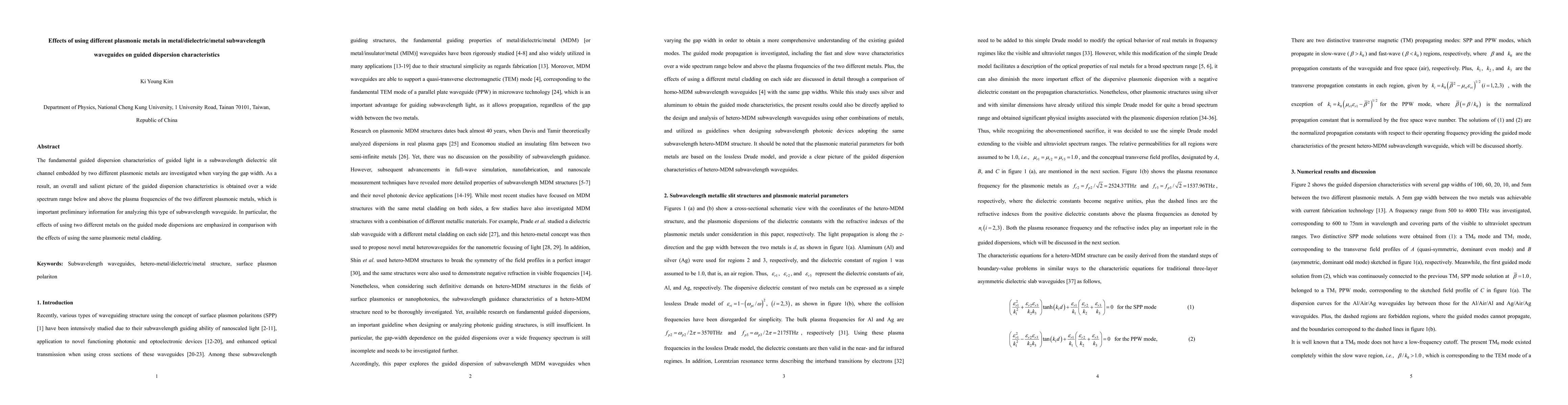 This study investigates the guided dispersion characteristics of subwavelength waveguides with different plasmonic metals in the metal/dielectric/metal configuration, focusing on variations in gap width. The research highlights the differences in guided mode dispersions when using two distinct metals compared to using the same metal cladding, providing essential preliminary insights for this waveguide type.