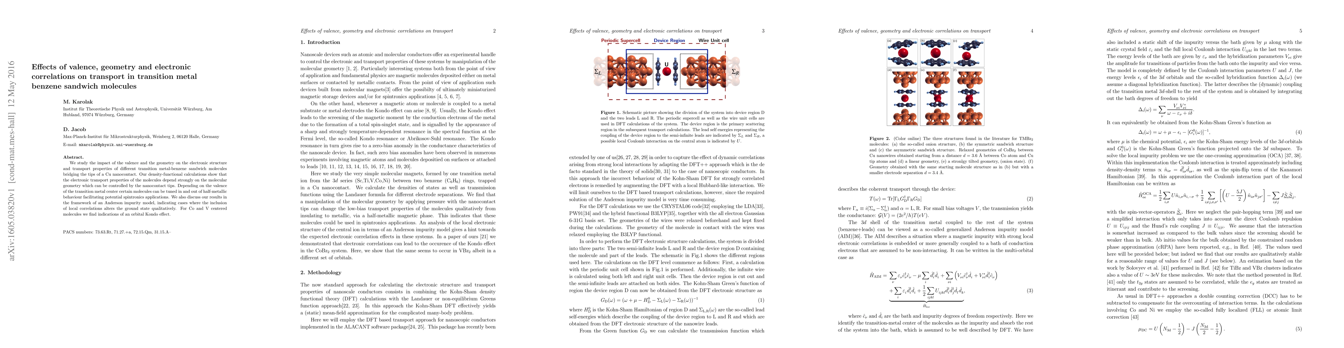 This paper investigates how the geometry and valence of transition metal-benzene sandwich molecules influence their electronic structure and transport properties when connected to a Cu nanocontact. Density-functional calculations reveal that molecular geometry, controllable via the nanocontact, significantly affects transport, with certain metals enabling half-metallic behavior for spintronics applications. The study also explores the impact of electronic correlations, finding an orbital Kondo effect in Co and V centered molecules.