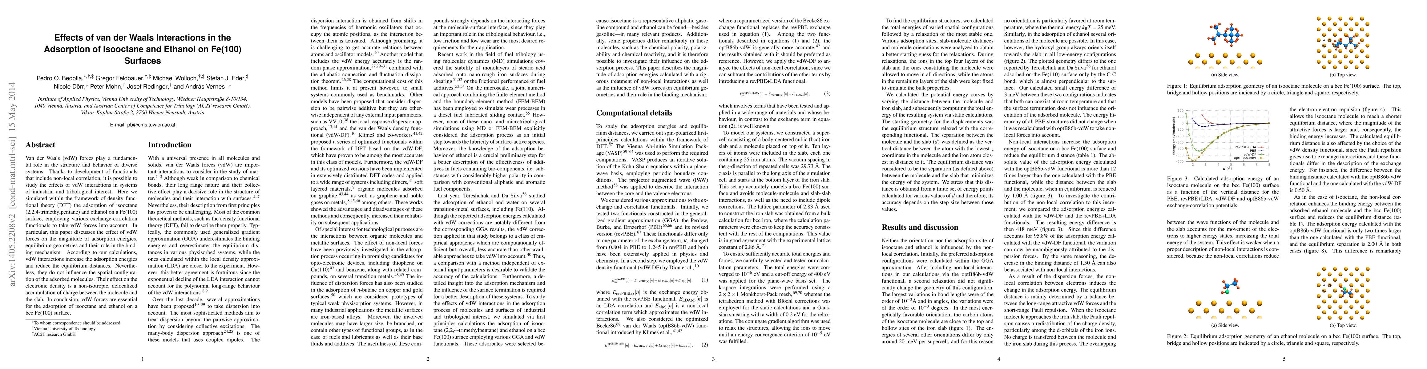 Van der Waals (vdW) forces play a fundamental role in the structure and behavior of diverse systems. Thanks to development of functionals that include non-local correlation, it is possible to study the effects of vdW interactions in systems of industrial and tribological interest. Here we simulated within the framework of density functional theory (DFT) the adsorption of isooctane (2,2,4-trimethylpentane) and ethanol on a Fe(100) surface, employing various exchange-correlation functionals to take vdW forces into account. In particular, this paper discusses the effect of vdW forces on the magnitude of adsorption energies, equilibrium geometries and their role in the binding mechanism. According to our calculations, vdW interactions increase the adsorption energies and reduce the equilibrium distances. Nevertheless, they do not influence the spatial configuration of the adsorbed molecules. Their effect on the electronic density is a non-isotropic, delocalized accumulation of charge between the molecule and the slab. In conclusion, vdW forces are essential for the adsorption of isooctane and ethanol on a bcc Fe(100) surface.