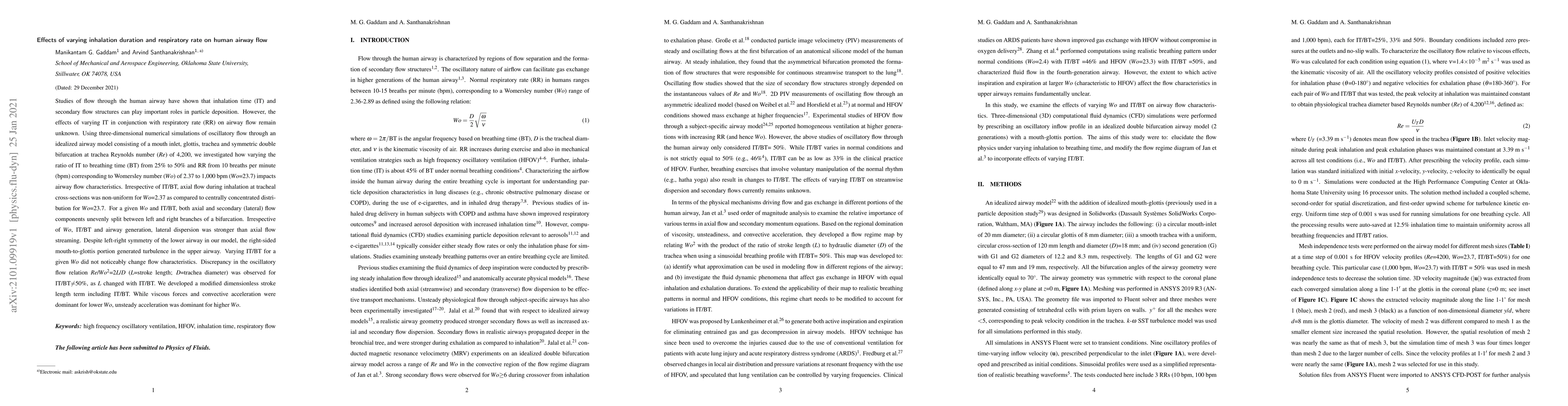 This study uses 3D numerical simulations to explore how varying inhalation duration (IT) relative to breathing time (BT) and respiratory rate (RR) affect human airway flow. Results show that axial flow is non-uniform at lower RR, while secondary flow components are more unevenly distributed than axial flow, with turbulence generated in the upper airway despite symmetry.