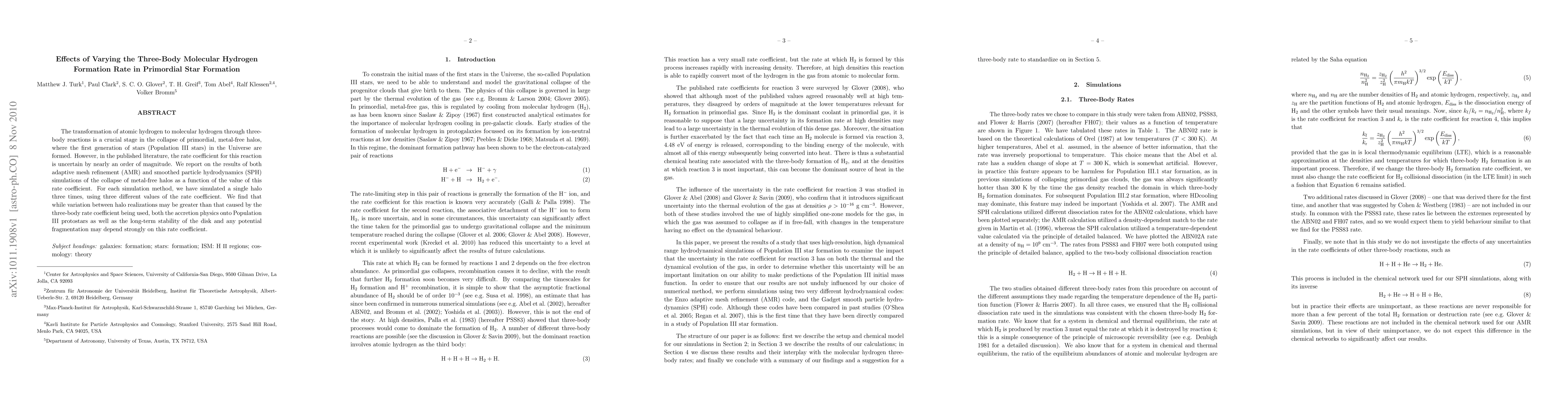 The transformation of atomic hydrogen to molecular hydrogen through three-body reactions is a crucial stage in the collapse of primordial, metal-free halos, where the first generation of stars (Population III stars) in the Universe are formed. However, in the published literature, the rate coefficient for this reaction is uncertain by nearly an order of magnitude. We report on the results of both adaptive mesh refinement (AMR) and smoothed particle hydrodynamics (SPH) simulations of the collapse of metal-free halos as a function of the value of this rate coefficient. For each simulation method, we have simulated a single halo three times, using three different values of the rate coefficient. We find that while variation between halo realizations may be greater than that caused by the three-body rate coefficient being used, both the accretion physics onto Population III protostars as well as the long-term stability of the disk and any potential fragmentation may depend strongly on this rate coefficient.