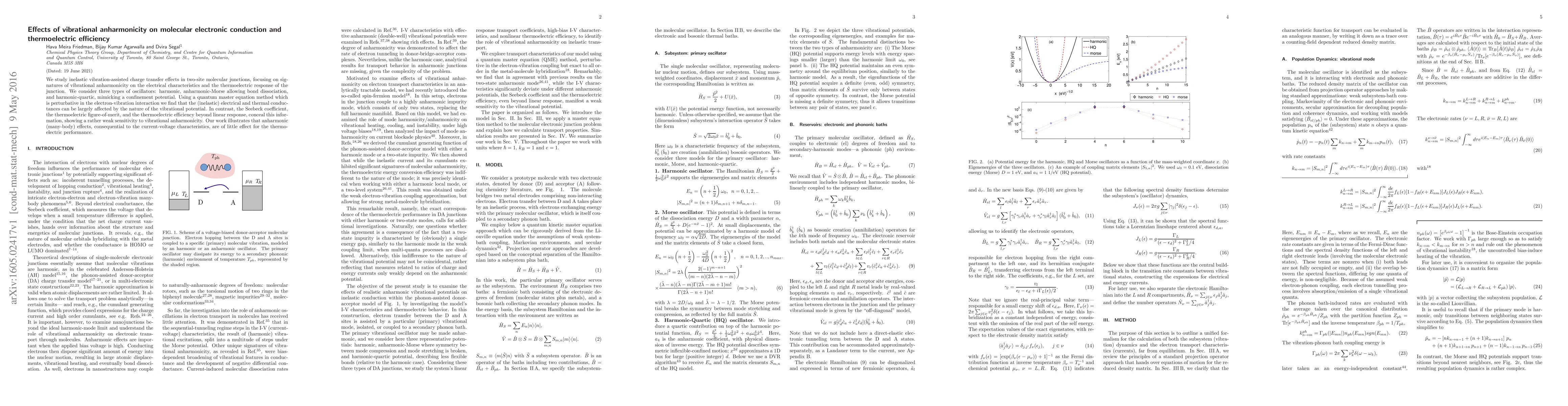 This paper investigates how vibrational anharmonicity influences molecular electronic conduction and thermoelectric efficiency in two-site molecular junctions. It finds that while anharmonic effects significantly alter electrical and thermal conductances, they have minimal impact on the thermoelectric figure-of-merit and efficiency beyond linear response.