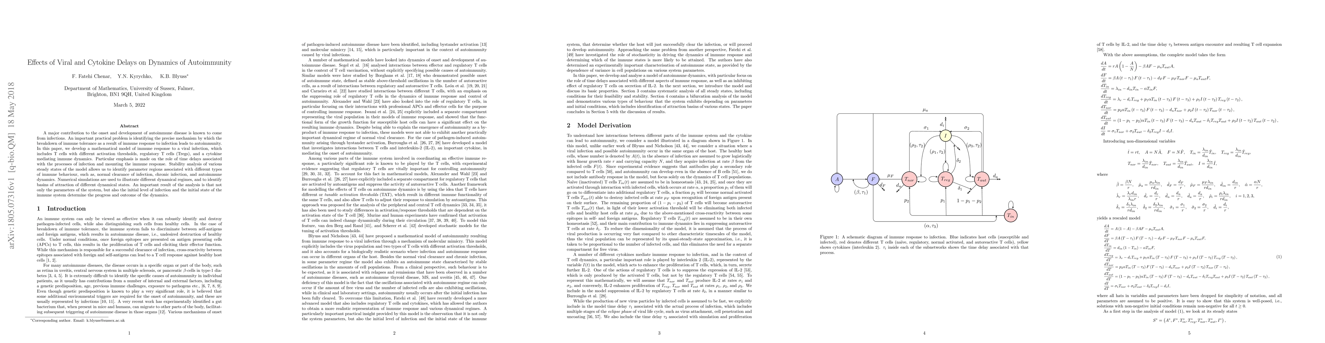 This paper develops a mathematical model to explore how viral infections and cytokine delays influence immune response dynamics, leading to different outcomes such as normal clearance, chronic infection, or autoimmunity. The analysis highlights the critical role of time delays and initial conditions in determining the progression and outcome of immune behavior.