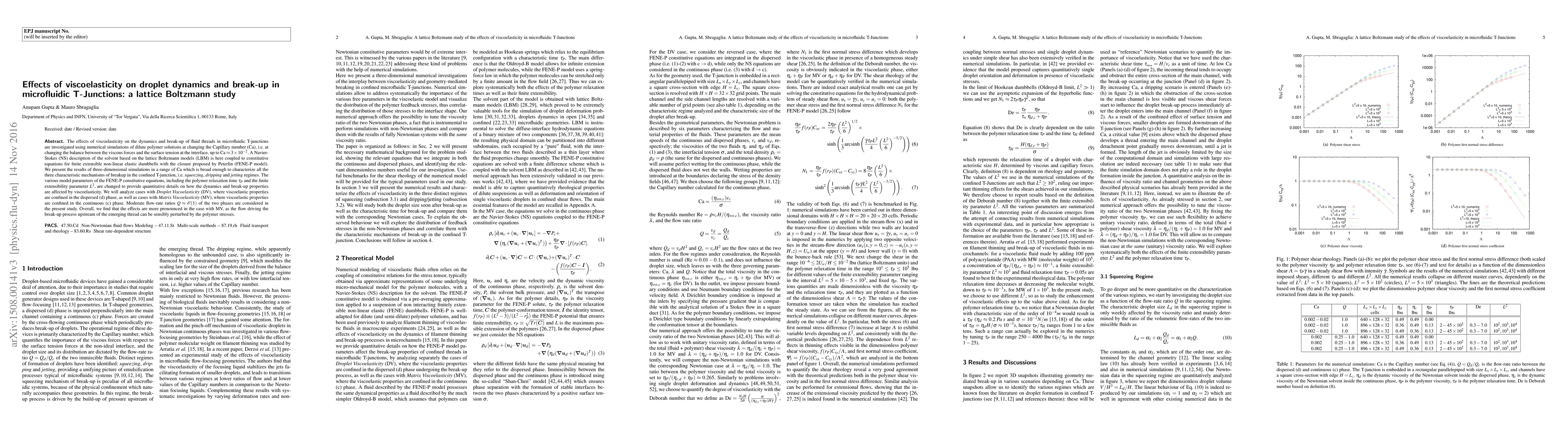 This study investigates the impact of viscoelasticity on droplet dynamics and break-up in microfluidic T-junctions using lattice Boltzmann simulations of dilute polymer solutions. The research explores various regimes of droplet formation, including squeezing, dripping, and jetting, under different Capillary numbers and viscoelastic parameters. Results show that matrix viscoelasticity significantly affects the breakup process by altering the flow dynamics upstream.