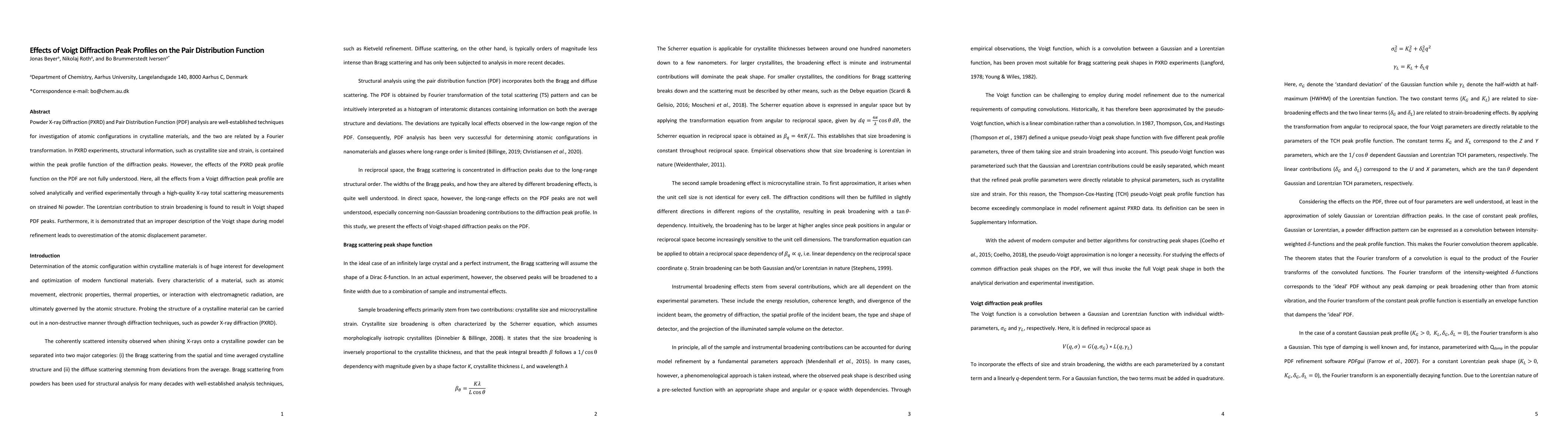 This paper investigates how Voigt diffraction peak profiles affect the Pair Distribution Function (PDF) in crystalline materials, solving these effects analytically and verifying them experimentally on strained Ni powder. It finds that strain broadening results in Voigt-shaped PDF peaks and warns against overestimation of atomic displacement parameters due to incorrect Voigt shape modeling.