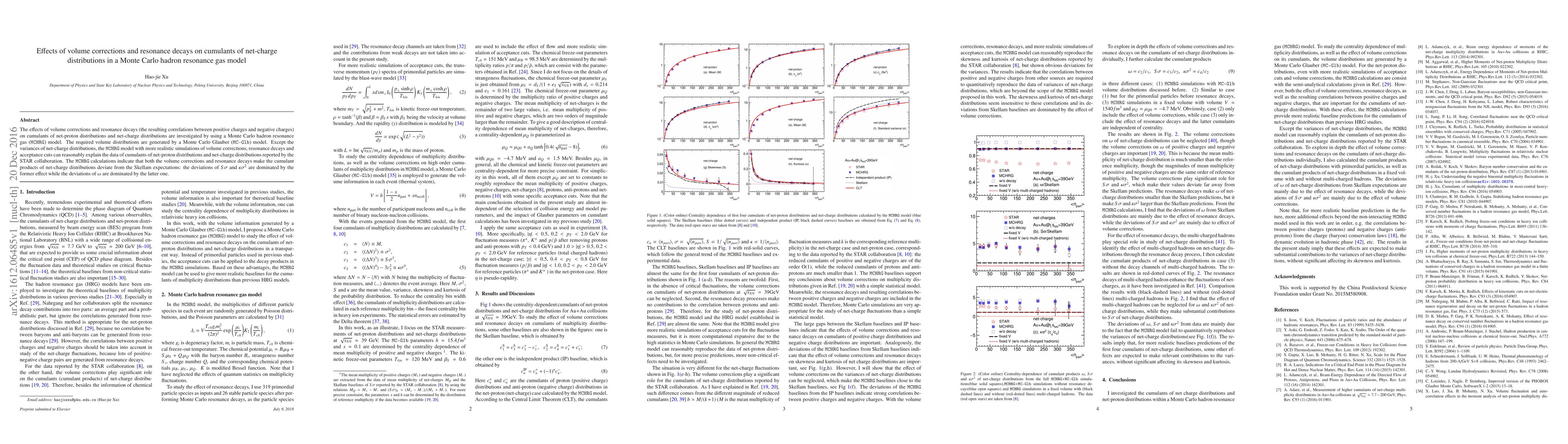 This paper investigates how volume corrections and resonance decays impact cumulants of net-charge distributions using a Monte Carlo hadron resonance gas model. The study finds that while volume corrections and resonance decays both affect cumulant products, volume corrections primarily influence $S\sigma$ and $\kappa\sigma^{2}$, while resonance decays mainly affect $\omega$.