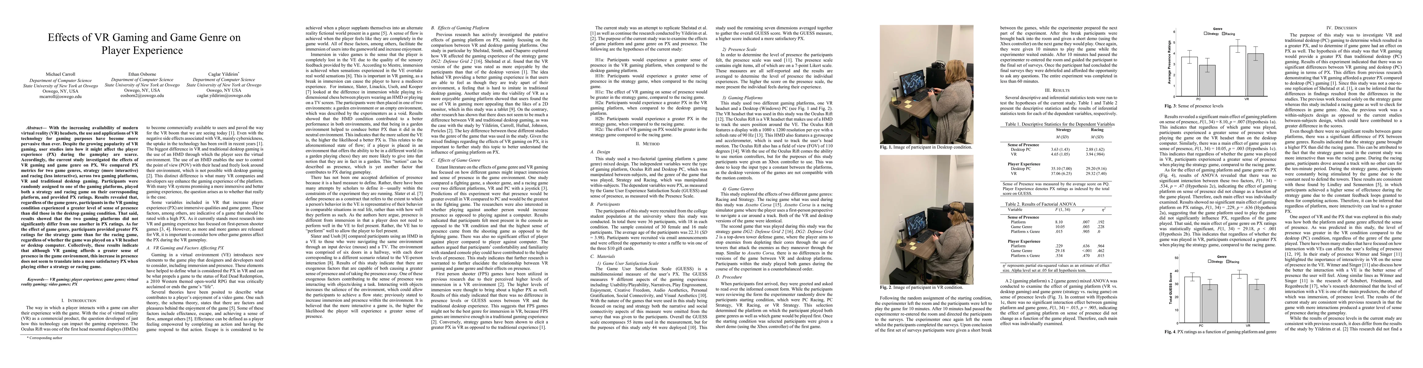 This study explores the impact of VR gaming and game genre on player experience (PX), comparing strategy and racing games on VR and desktop platforms. Results show VR gaming enhances sense of presence but does not significantly improve PX ratings compared to desktop gaming, with strategy games generally receiving higher PX ratings than racing games.