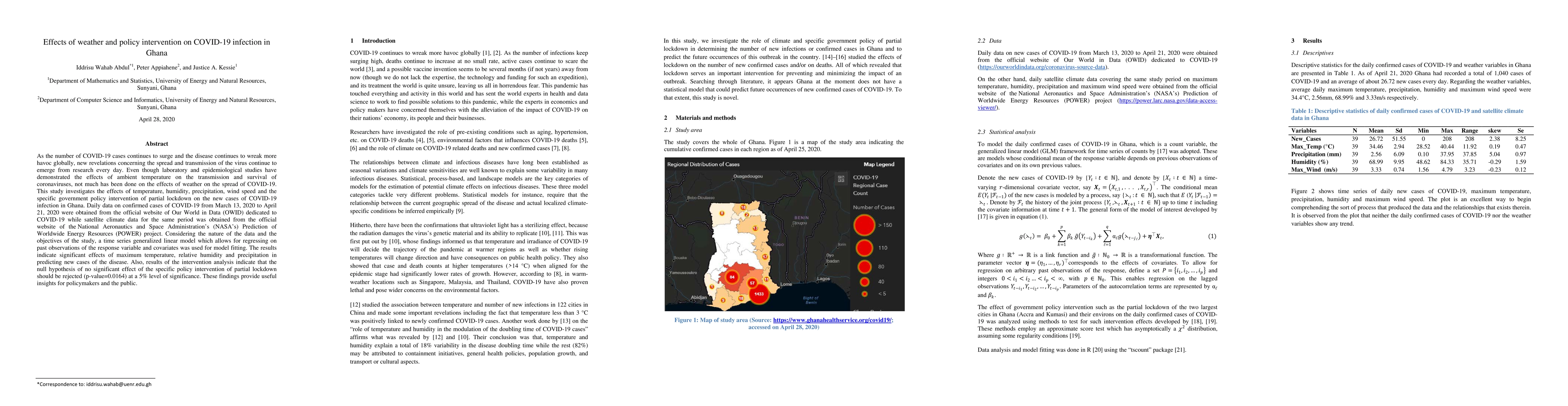 Even though laboratory and epidemiological studies have demonstrated the effects of ambient temperature on the transmission and survival of coronaviruses, not much has been done on the effects of weather on the spread of COVID-19. This study investigates the effects of temperature, humidity, precipitation, wind speed and the specific government policy intervention of partial lockdown on the new cases of COVID-19 infection in Ghana. Daily data on confirmed cases of COVID-19 from March 13, 2020 to April 21, 2020 were obtained from the official website of Our World in Data (OWID) dedicated to COVID-19 while satellite climate data for the same period was obtained from the official website of NASA's Prediction of Worldwide Energy Resources (POWER) project. Considering the nature of the data and the objectives of the study, a time series generalized linear model which allows for regressing on past observations of the response variable and covariates was used for model fitting. The results indicate significant effects of maximum temperature, relative humidity and precipitation in predicting new cases of the disease. Also, results of the intervention analysis indicate that the null hypothesis of no significant effect of the specific policy intervention of partial lockdown should be rejected (p-value=0.0164) at a 5\% level of significance. These findings provide useful insights for policymakers and the public.