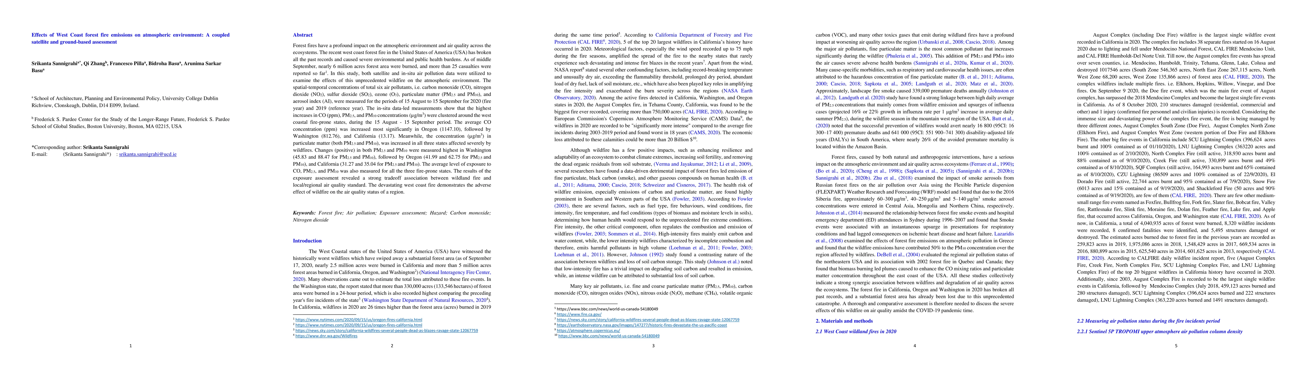 This study assesses the impact of the 2020 West Coast forest fires on air quality using satellite and ground-based data, finding significant increases in CO, PM2.5, and PM10 concentrations in Oregon, Washington, and California, with Oregon experiencing the highest rise in CO levels and Washington in particulate matter.