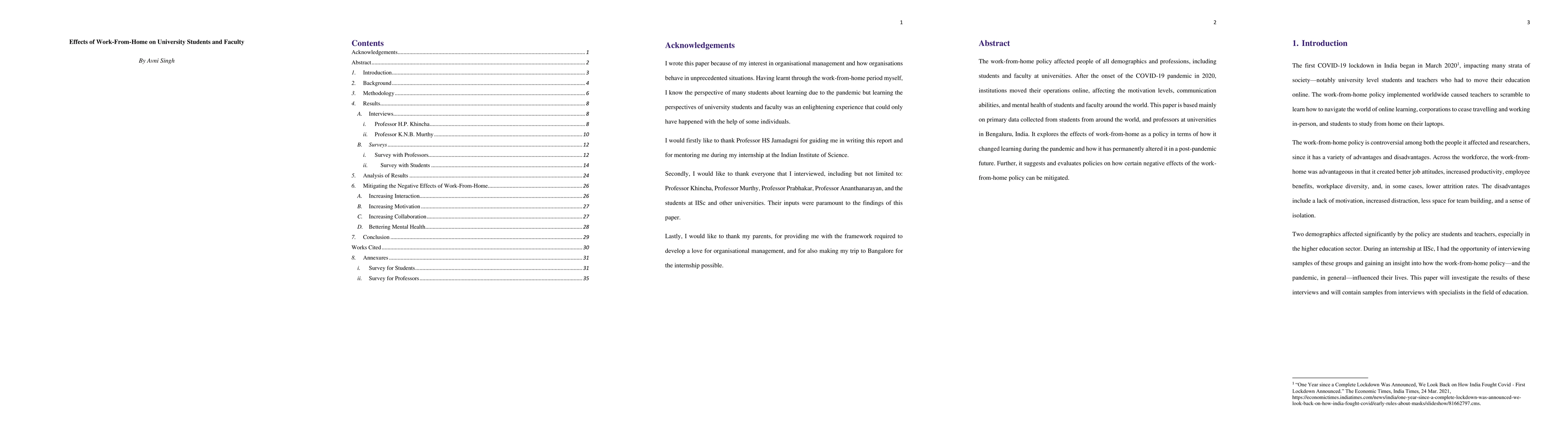 The work-from-home policy affected people of all demographics and professions, including students and faculty at universities. After the onset of the COVID-19 pandemic in 2020, institutions moved their operations online, affecting the motivation levels, communication abilities, and mental health of students and faculty around the world. This paper is based mainly on primary data collected from students from around the world, and professors at universities in Bengaluru, India. It explores the effects of work-from-home as a policy in terms of how it changed learning during the pandemic and how it has permanently altered it in a post-pandemic future. Further, it suggests and evaluates policies on how certain negative effects of the work-from-home policy can be mitigated.