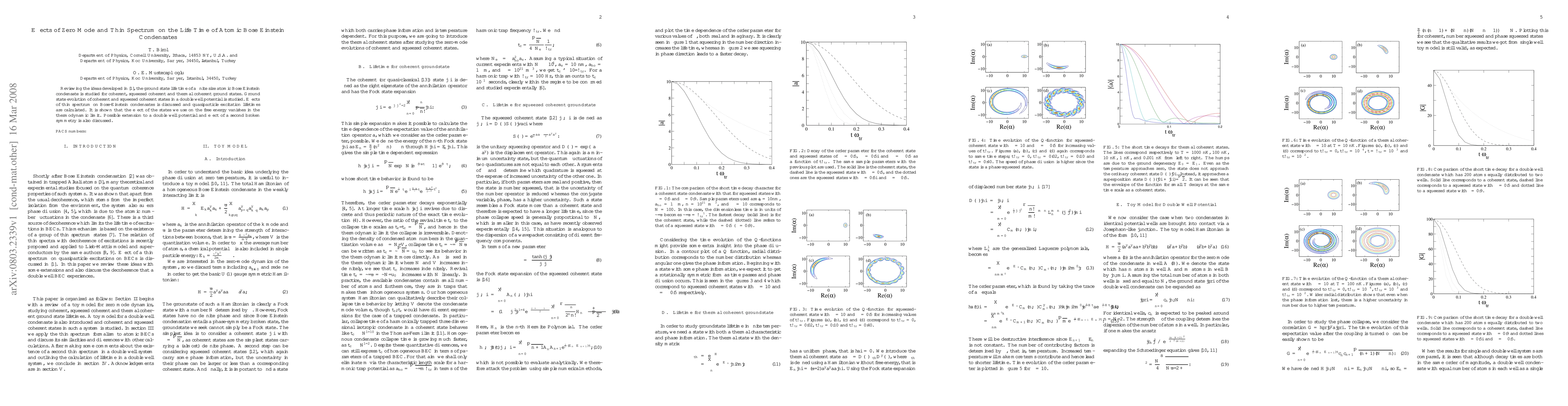Reviewing the ideas developed in, the ground state life time of a finite size atomic Bose Einstein condensate is studied for coherent, squeezed coherent and thermal coherent ground states. Ground state evolution of coherent and squeezed coherent states in a double well potential is studied. Effects of thin spectrum on Bose-Einstein condensates is discussed and quasiparticle excitation lifetimes are calculated. It is shown that the effect of the states we use on the free energy vanishes in the thermodynamic limit. Possible extension to a double well potential and effect of a second broken symmetry is also discussed.