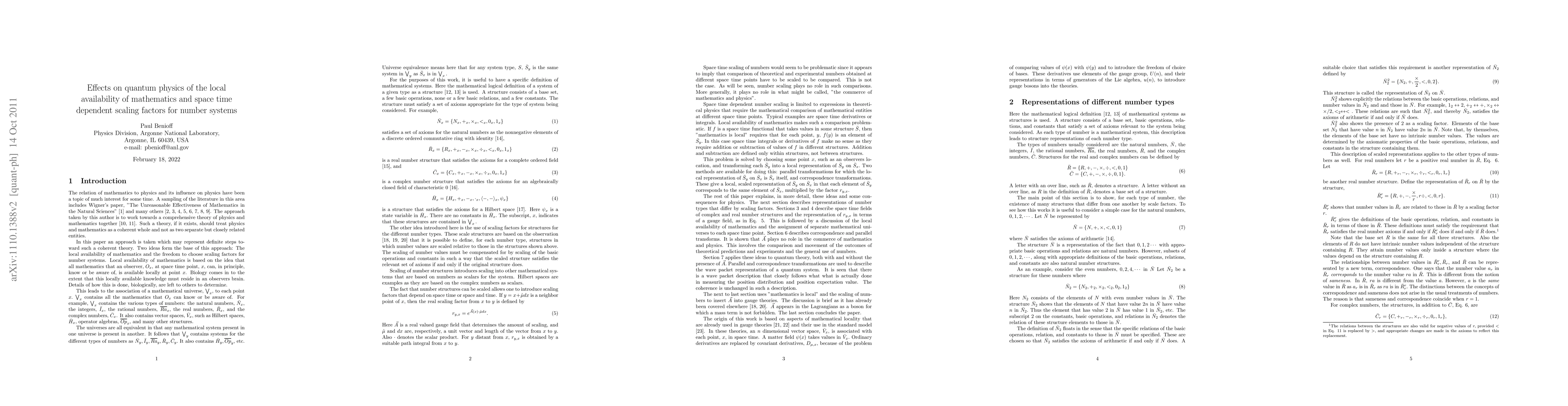 The work is based on two premises: local availability of mathematics to an observer at any space time location, and the observation that number systems, as structures satisfying axioms for the number type being considered, can be scaled by arbitrary, positive real numbers. Local availability leads to the assignment of mathematical universes, $V_{x},$ to each point, $x,$ of space time. $V_{x}$ contains all the mathematics that an observer, $O_{x},$ at $x,$ can know. Each $V_{x}$ contains many types of mathematical systems. These include the different types of numbers (natural numbers, integers, rationals, and real and complex numbers), Hilbert spaces, algebras, and many other types of systems. Space time dependent scaling of number systems is used to define representations, in $V_{x}$, of real and complex number systems in $V_{y}$. The representations are scaled by a factor $r_{y,x}$ relative to the systems in $V_{x}.$ For $y$ a neighbor point of $x,$ $r_{y,x}$ is the exponential of the scalar product of a gauge field, $\vec{A}(x),$ and the vector from $x$ to $y.$ For $y$ distant from $x,$ $r_{y,x}$ is a path integral from $x$ to $y.$ Some consequences of the two premises will be examined. Number scaling has no effect on general comparisons of numbers obtained as computations or as experimental outputs. The effect is limited to mathematical expressions that include space or space time integrals or derivatives. The effect of $\vec{A}$ on wave packets and canonical momenta in quantum theory, and some properties of $\vec{A}$ in gauge theories, is described.