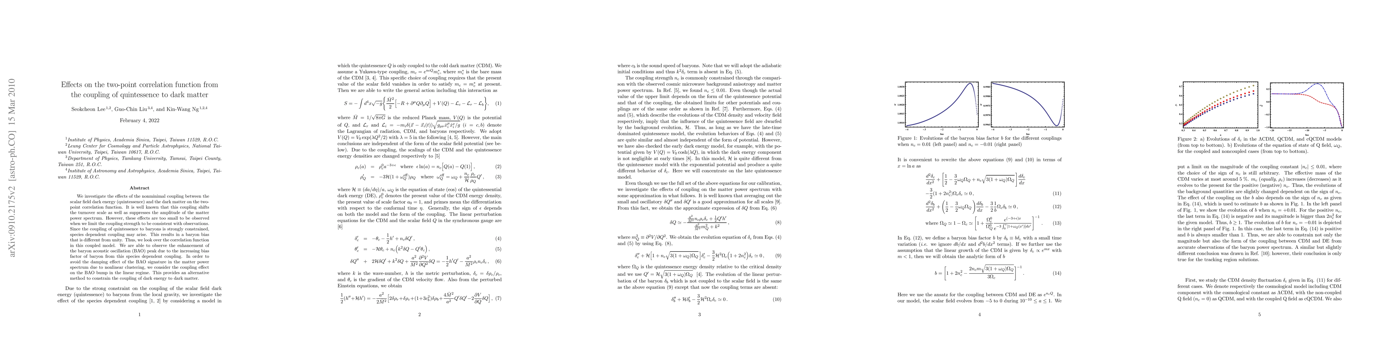 This paper examines the influence of quintessence-dark matter coupling on the two-point correlation function, finding that the non-coupled quintessence model fits better than the cosmological constant model. The study also observes an enhancement in the baryon acoustic oscillation peak due to species-dependent coupling, offering a new method to constrain dark energy-dark matter interactions.