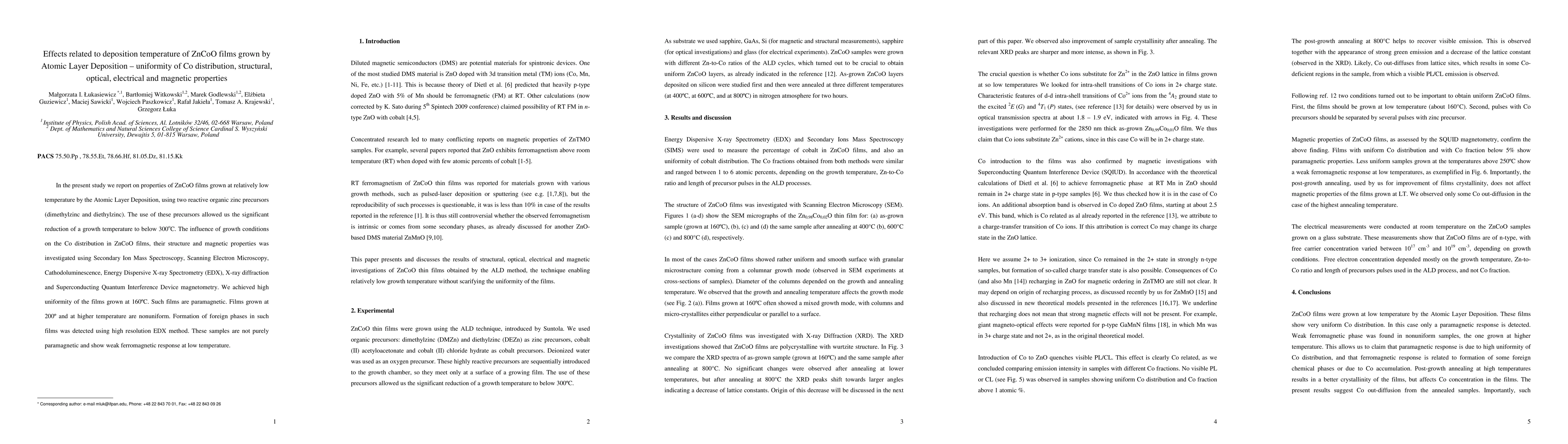 This study investigates ZnCoO films deposited at low temperatures via Atomic Layer Deposition using dimethylzinc and diethylzinc precursors, achieving growth below 300°C. Films grown at 160°C exhibit high uniformity and paramagnetic properties, while those grown at 200°C and above show nonuniformity and weak ferromagnetic behavior due to foreign phase formation.