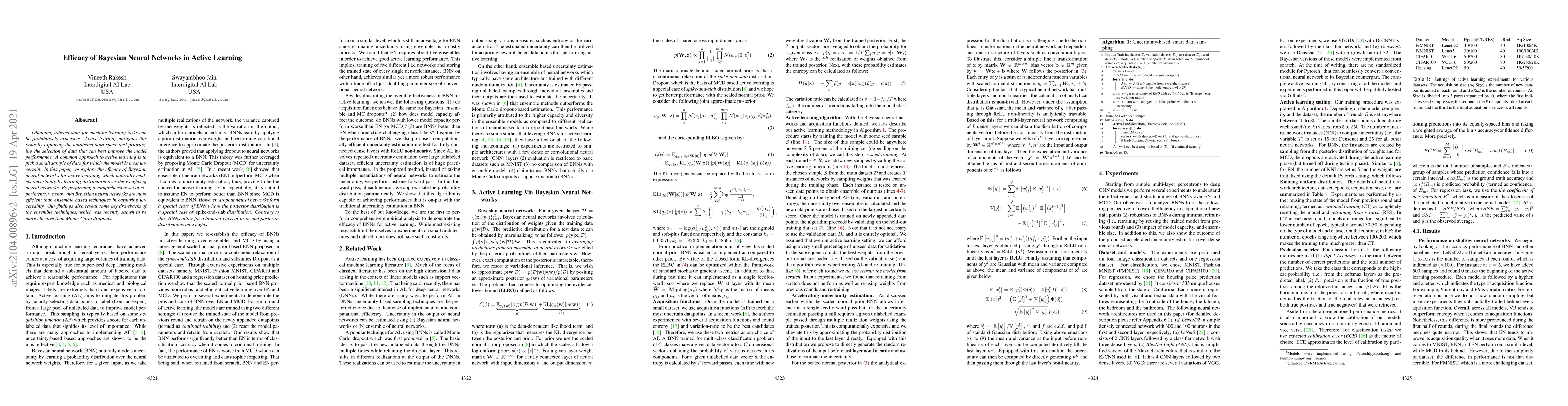 Obtaining labeled data for machine learning tasks can be prohibitively expensive. Active learning mitigates this issue by exploring the unlabeled data space and prioritizing the selection of data that can best improve the model performance. A common approach to active learning is to pick a small sample of data for which the model is most uncertain. In this paper, we explore the efficacy of Bayesian neural networks for active learning, which naturally models uncertainty by learning distribution over the weights of neural networks. By performing a comprehensive set of experiments, we show that Bayesian neural networks are more efficient than ensemble based techniques in capturing uncertainty. Our findings also reveal some key drawbacks of the ensemble techniques, which was recently shown to be more effective than Monte Carlo dropouts.