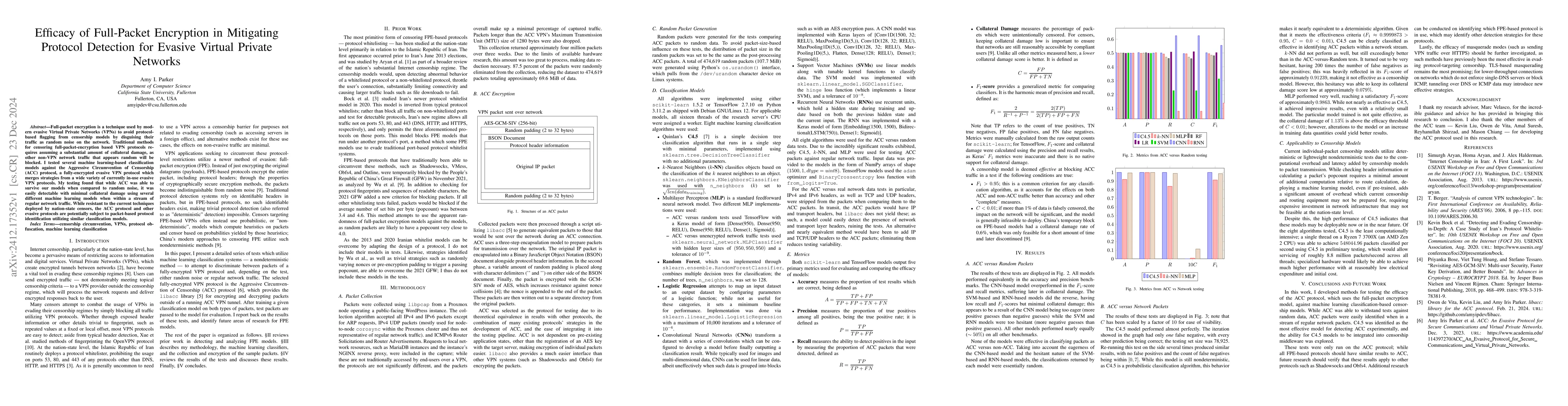 Full-packet encryption is a technique used by modern evasive Virtual Private Networks (VPNs) to avoid protocol-based flagging from censorship models by disguising their traffic as random noise on the network. Traditional methods for censoring full-packet-encryption based VPN protocols requires assuming a substantial amount of collateral damage, as other non-VPN network traffic that appears random will be blocked. I tested several machine learning-based classification models against the Aggressive Circumvention of Censorship (ACC) protocol, a fully-encrypted evasive VPN protocol which merges strategies from a wide variety of currently in-use evasive VPN protocols. My testing found that while ACC was able to survive our models when compared to random noise, it was easily detectable with minimal collateral damage using several different machine learning models when within a stream of regular network traffic. While resistant to the current techniques deployed by nation-state censors, the ACC protocol and other evasive protocols are potentially subject to packet-based protocol identification utilizing similar classification models.