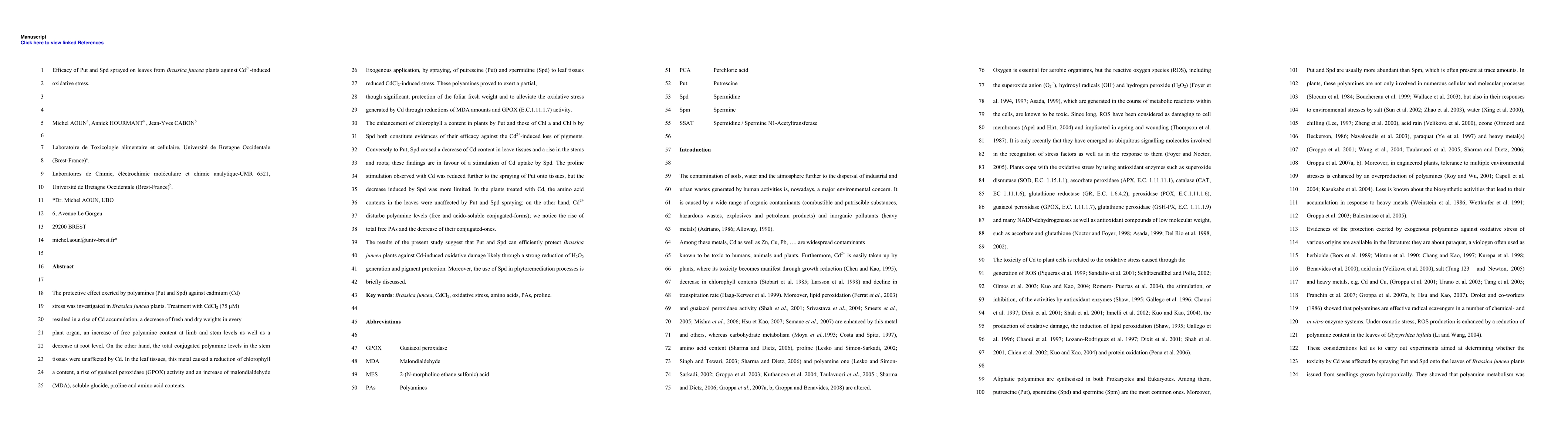 The protective effect exerted by polyamines (Put and Spd) against cadmium (Cd) stress was investigated in Brassica juncea plants. Treatment with CdCl2 (75 micro-Mole) resulted in a rise of Cd accumulation, a decrease of fresh and dry weights in every plant organ, an increase of free polyamine content at limb and stem levels as well as a decrease at root level. On the other hand, the total conjugated polyamine levels in the stem tissues were unaffected by Cd. In the leaf tissues, this metal caused a reduction of chlorophyll a content, a rise of guaiacol peroxidase (GPOX) activity and an increase of malondialdehyde (MDA), soluble glucide, proline and amino acid contents. Exogenous application, by spraying, of putrescine (Put) and spermidine (Spd) to leaf tissues reduced CdCl2-induced stress. These polyamines proved to exert a partial, though significant, protection of the foliar fresh weight and to alleviate the oxidative stress generated by Cd through reductions of MDA amounts and GPOX (E.C.1.11.1.7) activity. The enhancement of chlorophyll a content in plants by Put and those of Chl a and Chl b by Spd both constitute evidences of their efficacy against the Cd2+-induced loss of pigments. Conversely to Put, Spd caused a decrease of Cd content in leave tissues and a rise in the stems and roots; these findings are in favour of a stimulation of Cd uptake by Spd. The proline stimulation observed with Cd was reduced further to the spraying of Put onto tissues, but the decrease induced by Spd was more limited. In the plants treated with Cd, the amino acid contents in the leaves were unaffected by Put and Spd spraying; on the other hand, Cd2+ disturbed polyamine levels (free and acido-soluble conjugated-forms); we notice the rise of total free PAs and the decrease of their conjugated-ones.