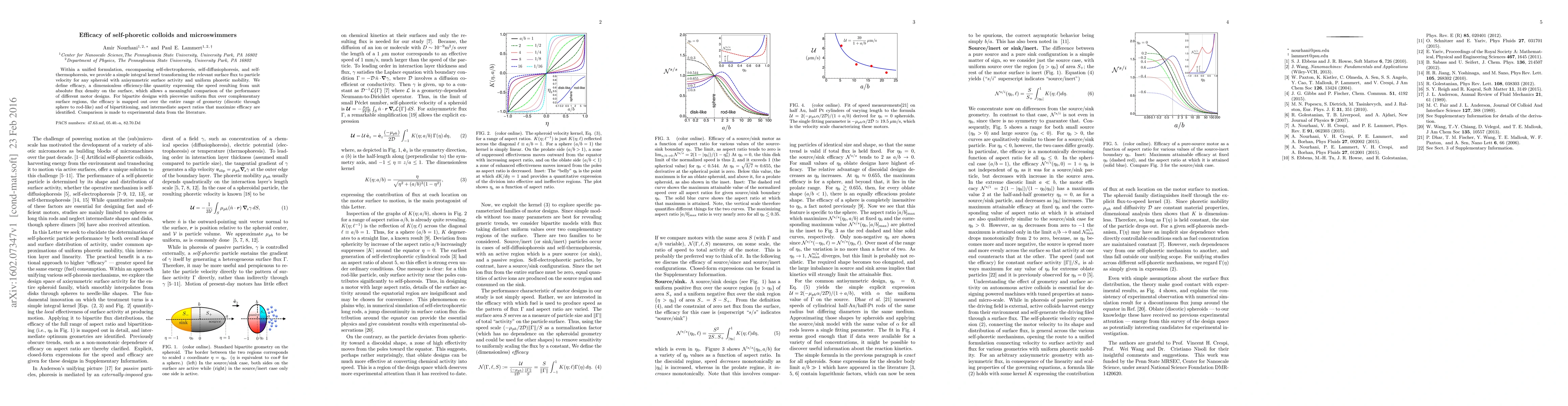 Within a unified formulation, encompassing self-electrophoresis, self-diffusiophoresis, and self-thermophoresis, we provide a simple integral kernel transforming the relevant surface flux to particle velocity for any spheroid with axisymmetric surface activity and uniform phoretic mobility. We define efficacy, a dimensionless efficiency-like quantity expressing the speed resulting from unit absolute flux density on the surface, which allows a meaningful comparison of the performance of different motor designs. For bipartite designs with piecewise uniform flux over complementary surface regions, the efficacy is mapped out over the entire range of geometry (discotic through sphere to rod-like) and of bipartitioning, and intermediate aspect ratios that maximize efficacy are identified. Comparison is made to experimental data from the literature.