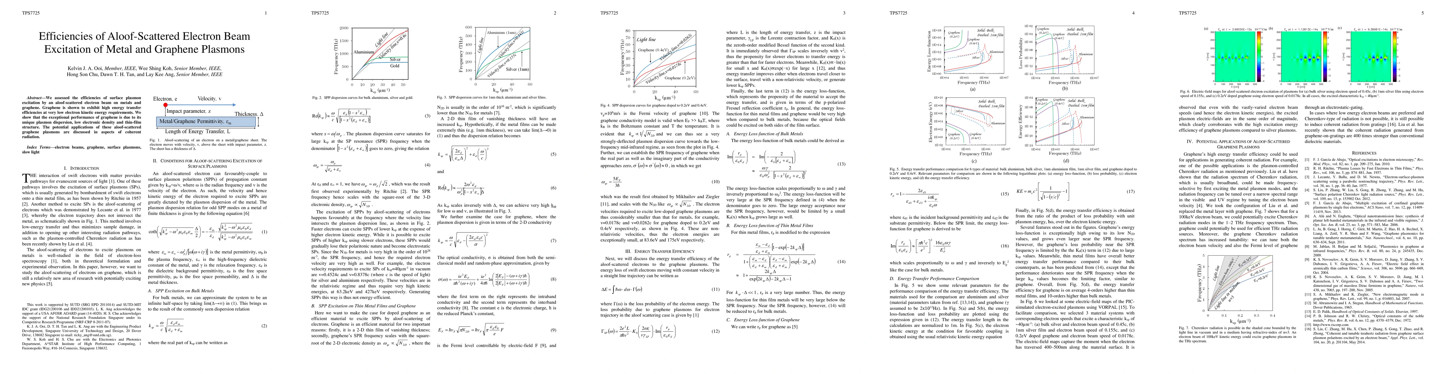 We assessed the efficiencies of surface plasmon excitation by an aloof-scattered electron beam on metals and graphene. Graphene is shown to exhibit high energy transfer efficiencies at very low electron kinetic energy requirements. We show that the exceptional performance of graphene is due to its unique plasmon dispersion, low electronic density and thin-film structure. The potential applications of these aloof-scattered graphene plasmons are discussed in aspects of coherent radiation.