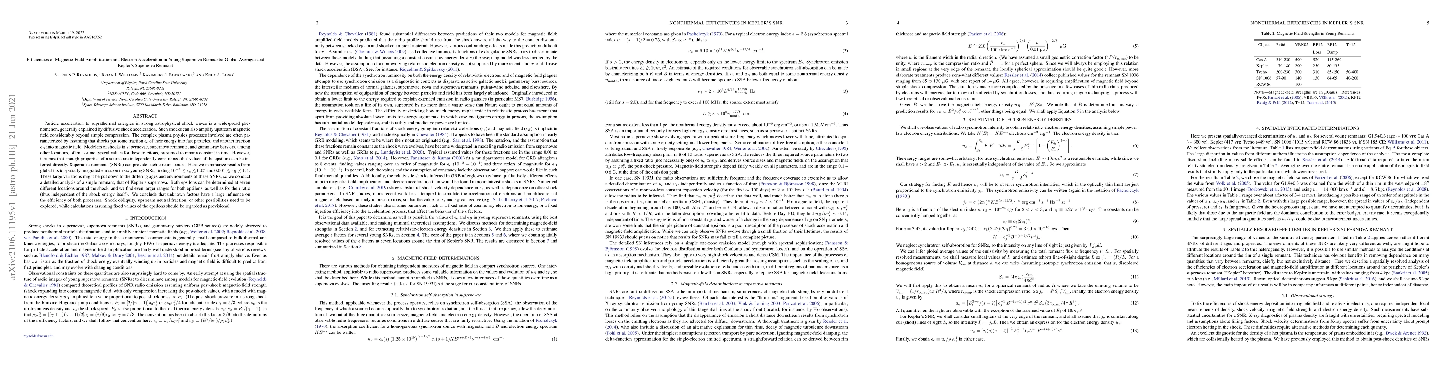 Researchers studied particle acceleration in young supernova remnants, finding large variations in energy efficiency between magnetic field amplification and electron acceleration. They propose that unknown factors influence these efficiencies, requiring further exploration.