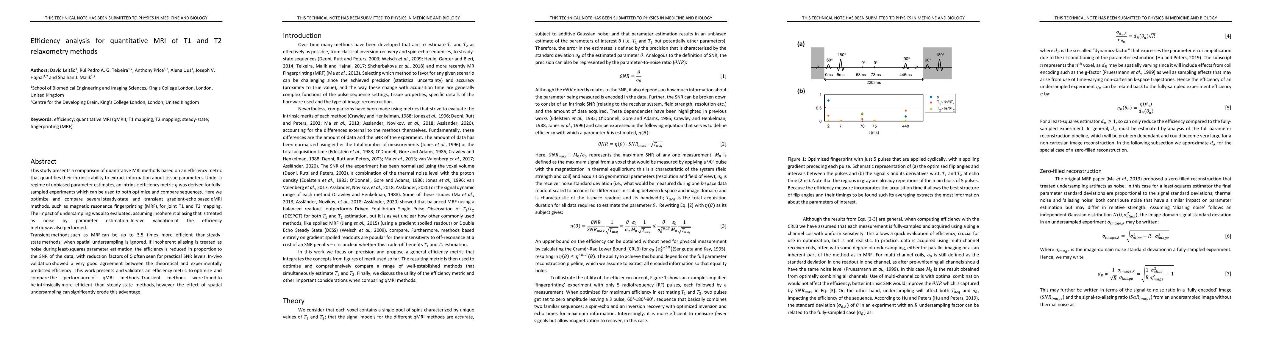 This study introduces an efficiency metric $\eta$ to compare quantitative MRI methods for T1 and T2 mapping, finding that transient methods like MRF are up to 3.5 times more efficient than steady-state methods. However, spatial undersampling and treating aliasing as noise reduce efficiency, with practical SNR levels often causing a 5-fold reduction.