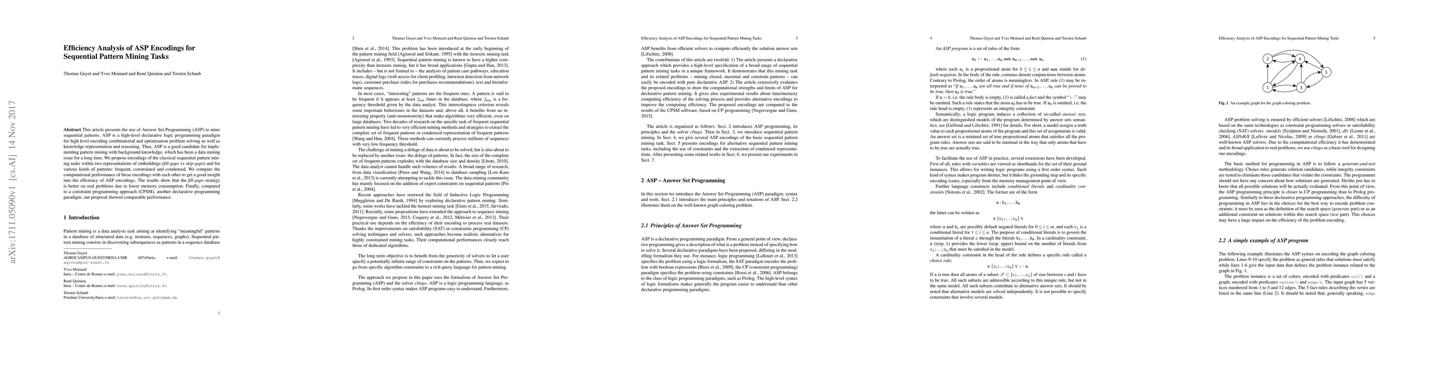 This paper evaluates ASP encodings for sequential pattern mining, comparing fill-gaps and skip-gaps strategies for various pattern types. The fill-gaps approach demonstrates lower memory usage and comparable performance to constraint programming, suggesting its efficiency for real-world problems.