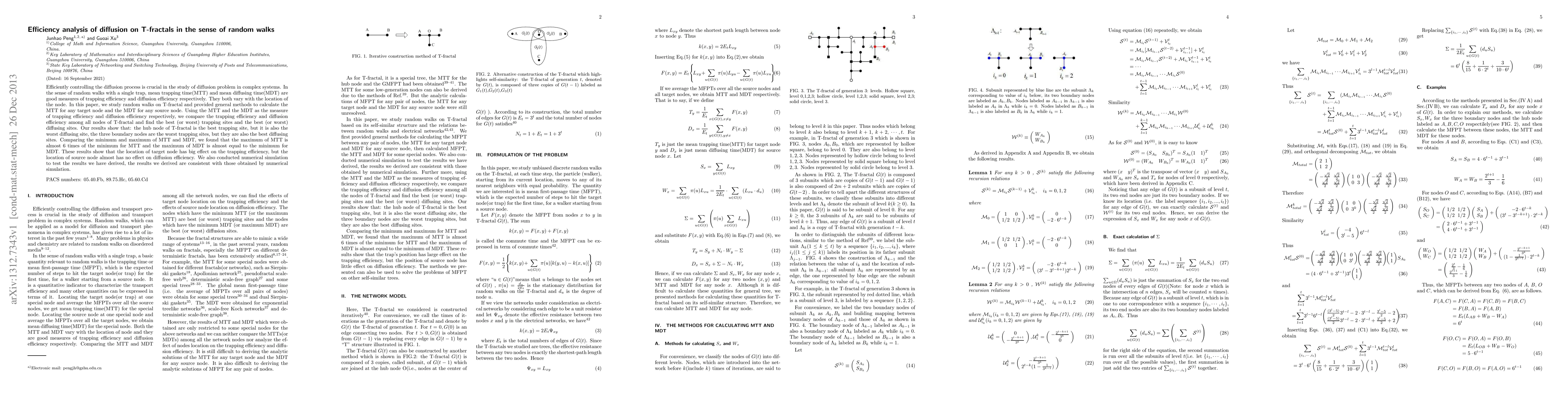 Efficiently controlling the diffusion process is crucial in the study of diffusion problem in complex systems. In the sense of random walks with a single trap, mean trapping time(MTT) and mean diffusing time(MDT) are good measures of trapping efficiency and diffusion efficiency respectively. They both vary with the location of the node. In this paper, we study random walks on T-fractal and provided general methods to calculate the MTT for any target node and the MDT for any source node. Using the MTT and the MDT as the measure of trapping efficiency and diffusion efficiency respectively, we compare the trapping efficiency and diffusion efficiency among all nodes of T-fractal and find the best (or worst) trapping sites and the best (or worst) diffusing sites. Our results show that: the hub node of T-fractal is the best trapping site, but it is also the worst diffusing site, the three boundary nodes are the worst trapping sites, but they are also the best diffusing sites. Comparing the minimum and maximum of MTT and MDT, we found that the maximum of MTT is almost $6$ times of the minimum for MTT and the maximum of MDT is almost equal to the minimum for MDT. These results show that the location of target node has big effect on the trapping efficiency, but the location of source node almost has no effect on diffusion efficiency. We also conducted numerical simulation to test the results we have derived, the results we derived are consistent with those obtained by numerical simulation.