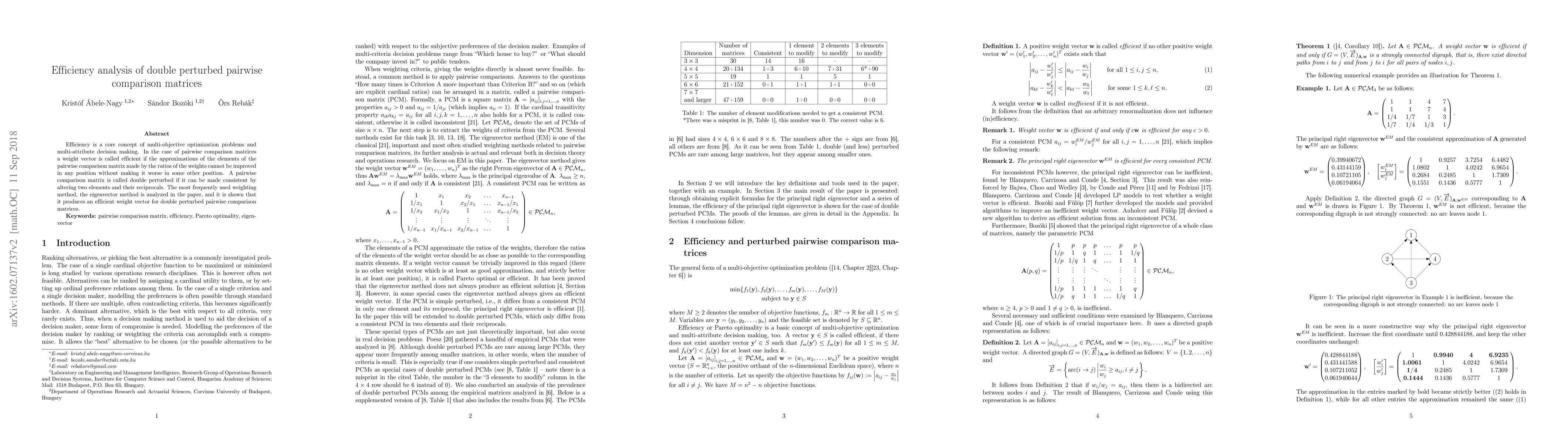 This paper analyzes the efficiency of weight vectors for double perturbed pairwise comparison matrices, demonstrating that the commonly used eigenvector method produces efficient weights, ensuring optimal approximations without trade-offs.