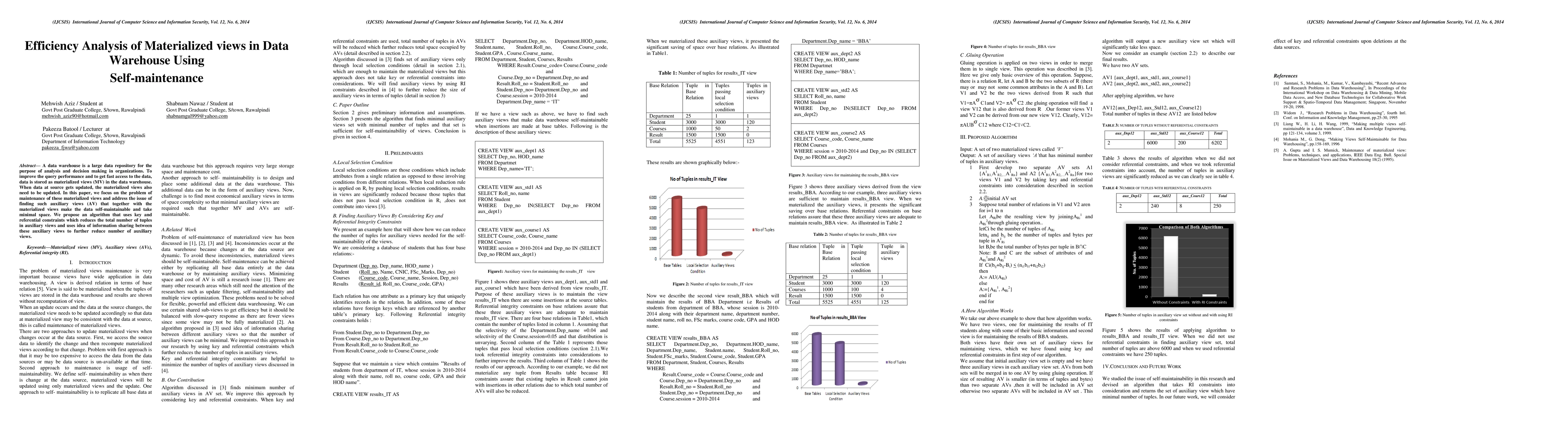 This paper proposes an algorithm to improve the efficiency of materialized views in data warehouses by introducing self-maintainable auxiliary views that minimize space usage and update overhead through key and referential constraints, and information sharing among views. The goal is to enhance query performance and data access speed.