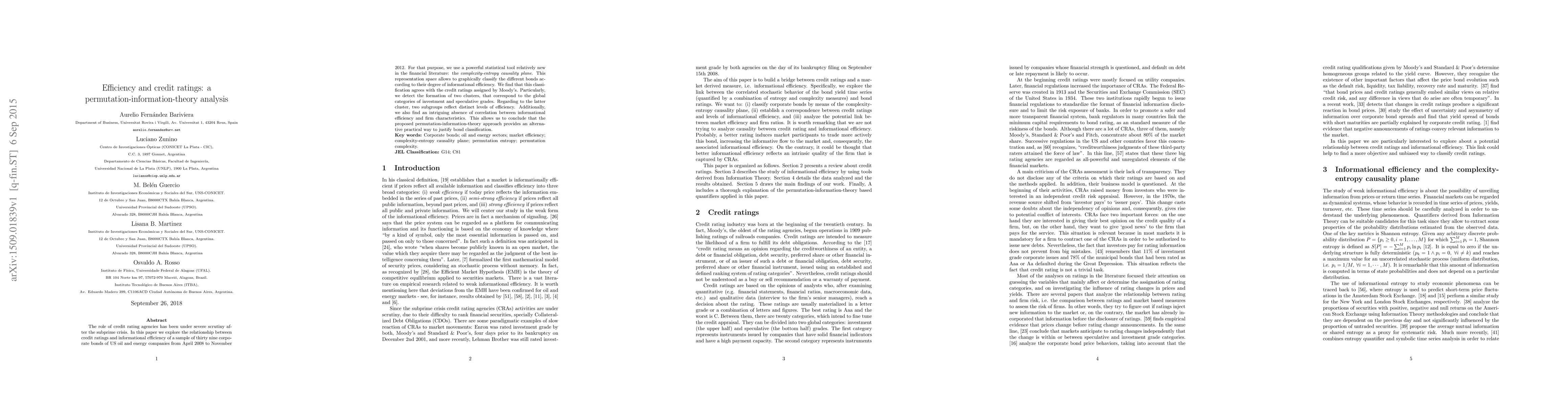 The role of credit rating agencies has been under severe scrutiny after the subprime crisis. In this paper we explore the relationship between credit ratings and informational efficiency of a sample of thirty nine corporate bonds of US oil and energy companies from April 2008 to November 2012. For that purpose, we use a powerful statistical tool relatively new in the financial literature: the complexity-entropy causality plane. This representation space allows to graphically classify the different bonds according to their degree of informational efficiency. We find that this classification agrees with the credit ratings assigned by Moody's. Particularly, we detect the formation of two clusters, that correspond to the global categories of investment and speculative grades. Regarding to the latter cluster, two subgroups reflect distinct levels of efficiency. Additionally, we also find an intriguing absence of correlation between informational efficiency and firm characteristics. This allows us to conclude that the proposed permutation-information-theory approach provides an alternative practical way to justify bond classification.