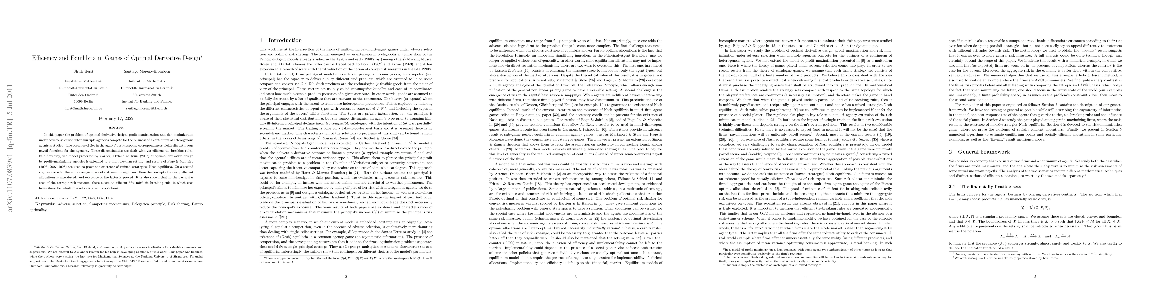 In this paper the problem of optimal derivative design, profit maximization and risk minimization under adverse selection when multiple agencies compete for the business of a continuum of heterogenous agents is studied. The presence of ties in the agents' best-response correspondences yields discontinuous payoff functions for the agencies. These discontinuities are dealt with via efficient tie--breaking rules. In a first step, the model presented by Carlier, Ekeland & Touzi (2007) of optimal derivative design by profit-maximizing agencies is extended to a multiple--firm setting, and results of Page & Monteiro (2003, 2007, 2008) are used to prove the existence of (mixed-strategies) Nash equilibria. On a second step we consider the more complex case of risk minimizing firms. Here the concept of socially efficient allocations is introduced, and existence of the latter is proved. It is also shown that in the particular case of the entropic risk measure, there exists an efficient "fix--mix" tie-breaking rule, in which case firms share the whole market over given proportions.