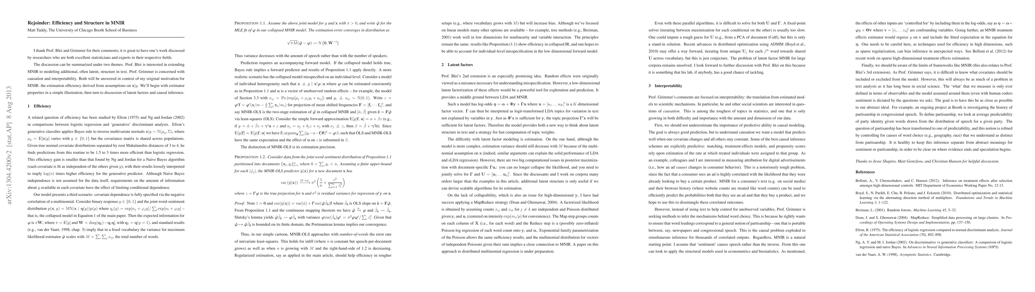 This rejoinder addresses and responds to the discussions and critiques raised regarding the "Multinomial Inverse Regression for Text Analysis" paper, emphasizing the efficiency and structural improvements proposed in the original work. It aims to clarify and further justify the methodological advancements presented.