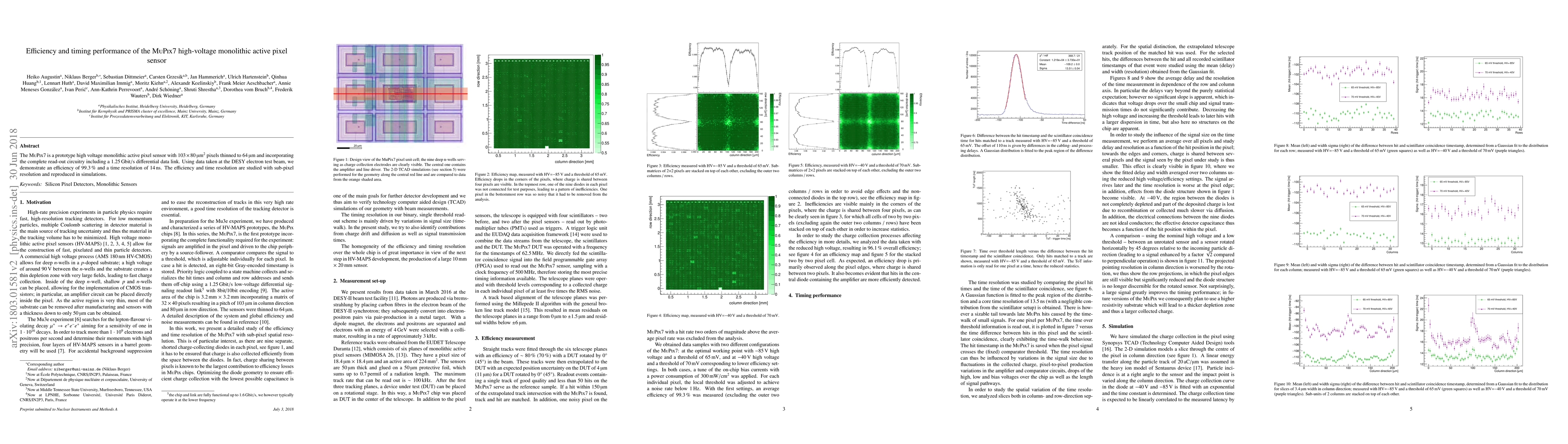 The MuPix7 sensor achieved 99.3% efficiency and a 14ns time resolution in high-speed data transmission, exceeding simulated results.