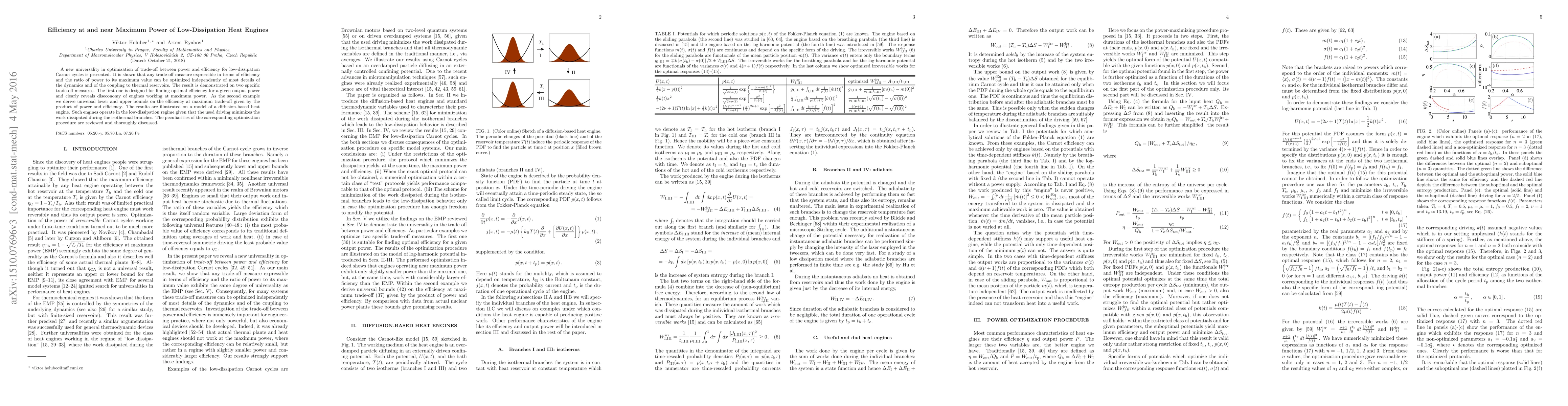 A new universality in optimization of trade-off between power and efficiency for low-dissipation Carnot cycles is presented. It is shown that any trade-off measure expressible in terms of efficiency and the ratio of power to its maximum value can be optimized independently of most details of the dynamics and of the coupling to thermal reservoirs. The result is demonstrated on two specific trade-off measures. The first one is designed for finding optimal efficiency for a given output power and clearly reveals diseconomy of engines working at maximum power. As the second example we derive universal lower and upper bounds on the efficiency at maximum trade-off given by the product of power and efficiency. The results are illustrated on a model of a diffusion-based heat engine. Such engines operate in the low-dissipation regime given that the used driving minimizes the work dissipated during the isothermal branches. The peculiarities of the corresponding optimization procedure are reviewed and thoroughly discussed.