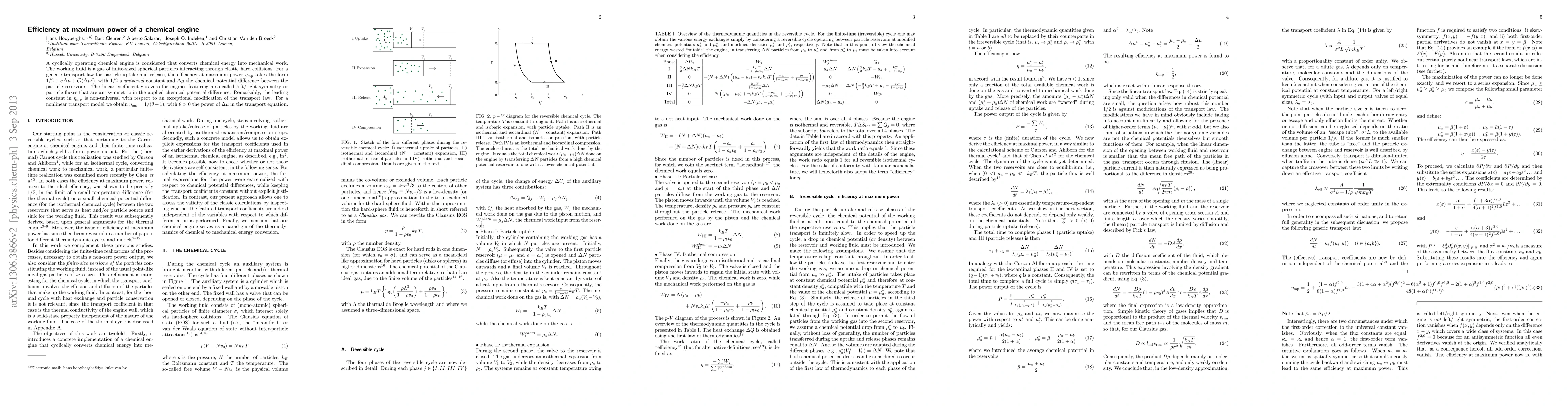 A chemical engine's efficiency at maximum power is found to depend on the linear coefficient c and a non-universal constant, with specific values depending on symmetry or antisymmetry in chemical potential differences. The efficiency is also found to be 1/( heta +1) for certain nonlinear transport models.