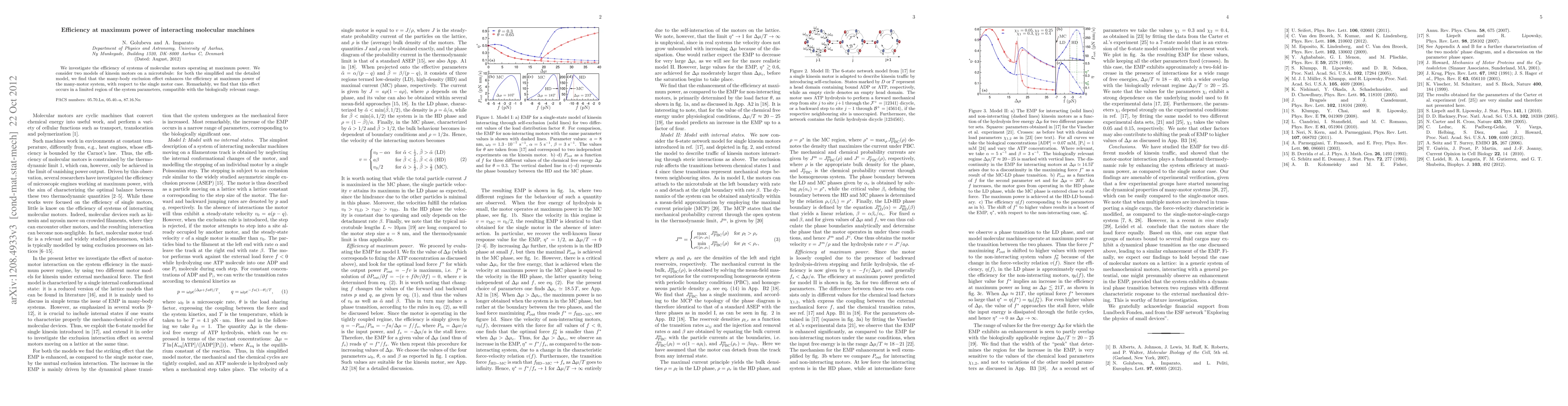 This study examines the efficiency of interacting molecular motors at maximum power, finding that many-body exclusion effects boost efficiency in systems of kinesin motors compared to single motors, particularly within biologically relevant parameter ranges.