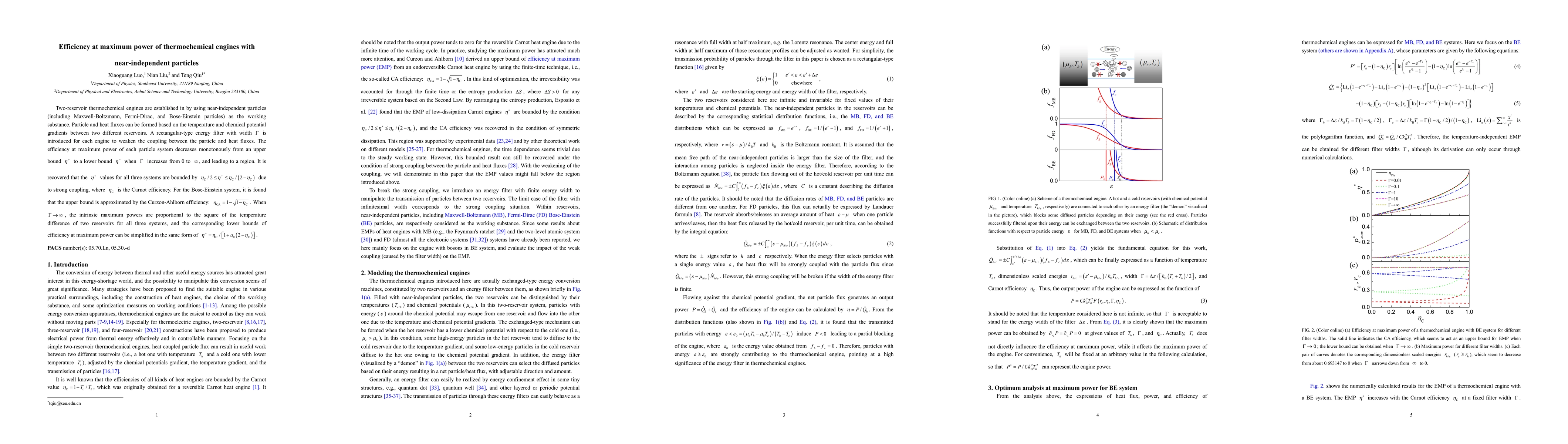 Two-reservoir thermochemical engines are established in by using near-independent particles (including Maxwell-Boltzmann, Fermi-Dirac, and Bose-Einstein particles) as the working substance. Particle and heat fluxes can be formed based on the temperature and chemical potential gradients between two different reservoirs. A rectangular-type energy filter with width $\Gamma$ is introduced for each engine to weaken the coupling between the particle and heat fluxes. The efficiency at maximum power of each particle system decreases monotonously from an upper bound $\eta^+$ to a lower bound $\eta^-$ when $\Gamma$ increases from 0 to $\infty$. It is found that the $\eta^+$ values for all three systems are bounded by $\eta_{\mathrm{C}}/2 \leq \eta^+ \leq \eta_{\mathrm{C}}/(2-\eta_{\mathrm{C}})$ due to strong coupling, where $\eta_{\mathrm{C}}$ is the Carnot efficiency. For the Bose-Einstein system, it is found that the upper bound is approximated by the Curzon-Ahlborn efficiency: $\eta_{\mathrm{CA}}=1-\sqrt{1-\eta _{\mathrm{C}}}$. When $\Gamma\rightarrow\infty$, the intrinsic maximum powers are proportional to the square of the temperature difference of two reservoirs for all three systems, and the corresponding lower bounds of efficiency at maximum power can be simplified in the same form of $\eta^{-}=\eta_{\mathrm{C}}/[1+a_0(2-\eta_{\mathrm{C}})]$.