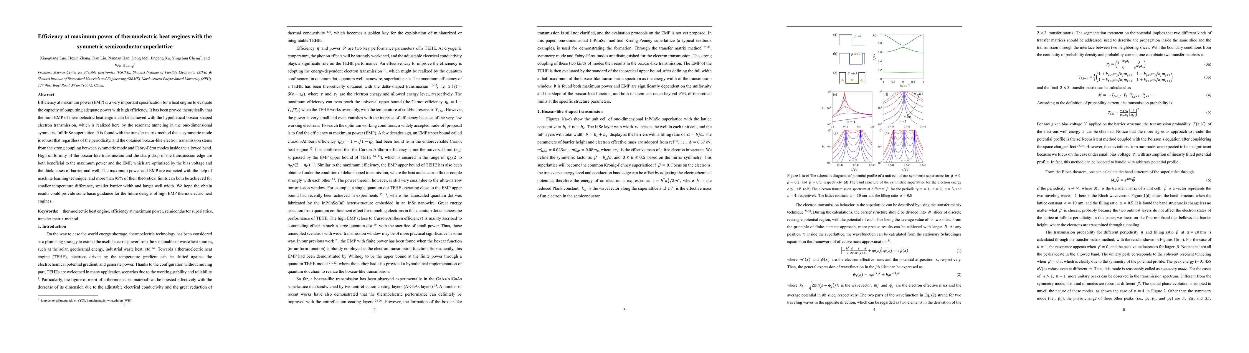This paper explores the efficiency at maximum power (EMP) of thermoelectric heat engines using a symmetric InP/InSe superlattice, demonstrating that resonant tunneling achieves near-theoretical limits for EMP through a boxcar-shaped electron transmission. The study optimizes EMP using machine learning techniques, showing that high EMP can be achieved under specific conditions, providing foundational insights for future high-efficiency thermoelectric designs.