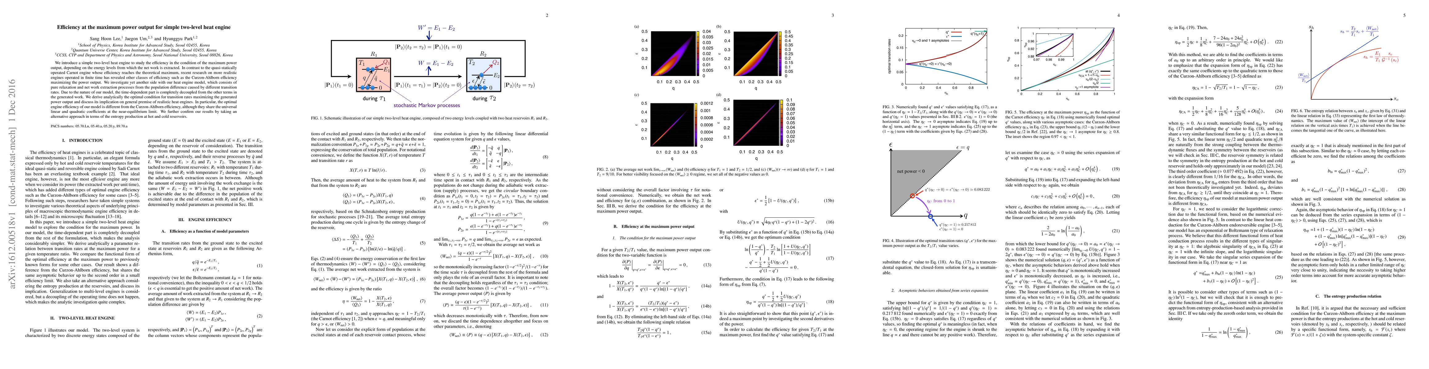 This paper investigates the efficiency of a simple two-level heat engine under maximum power output conditions, deriving an analytical expression for optimal transition rates. Unlike the Curzon-Ahlborn efficiency, the model's optimal efficiency differs, though both share similar coefficients near equilibrium, confirmed through entropy production analysis.